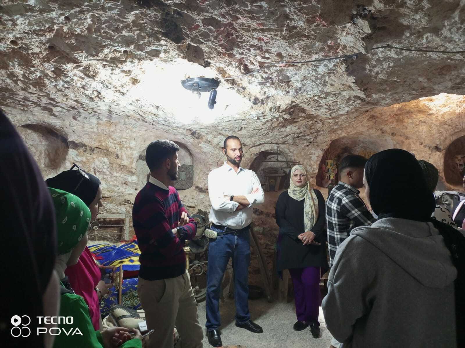 رافق المشاركين خلال الجولة ناصر أبو جابر من إدارة الكهف وتضمنت الجولة شرح مفصل عن تاريخ الكهف وعمل محتوى رقمي يضم دهاليز الكهف واقسام مختلفة منها القسم التراثي الذي يضم أدوات زراعية وحرفية وأدوات الطعام والشراب ومعظمها حديث نسبياً؛ كما خُصّص قسم للفخاريات وقسمٌ ثالث للتماثيل التي تعود لعصور مختلفة كالروماني واليوناني والبرونزي والحديدي والبيزنطي والإسلامي ويبين سحر المكان وتاريخه.
