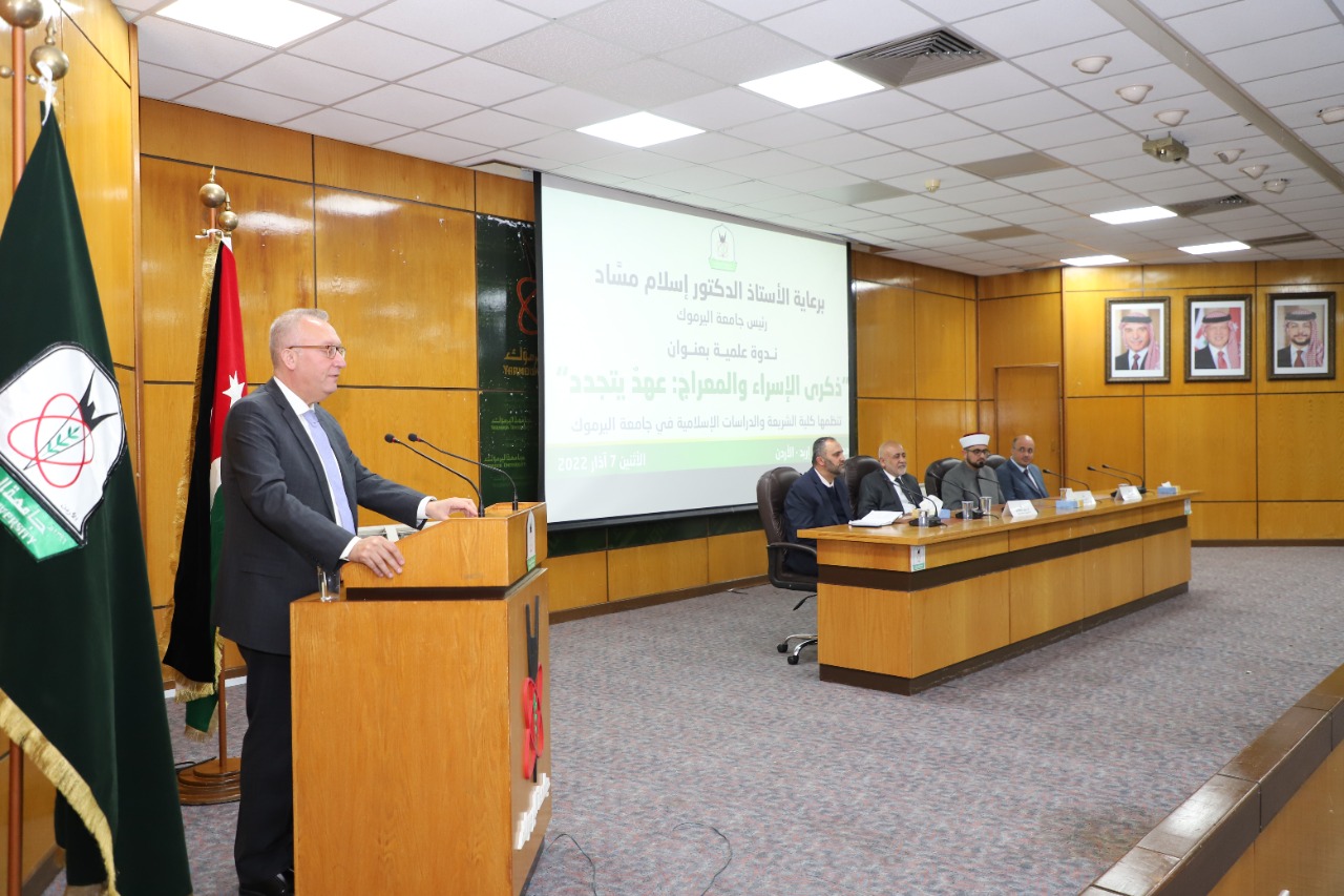رعى رئيس جامعة اليرموك الدكتور إسلام مسّاد افتتاح فعاليات ندوة "ذكرى الإسراء والمعراج: عهد يتجدد" والتي نظمتها كلية الشريعة والدراسات الإسلامية في الجامعة بمناسبة ذكرى الإسراء والمعراج الشريفين.