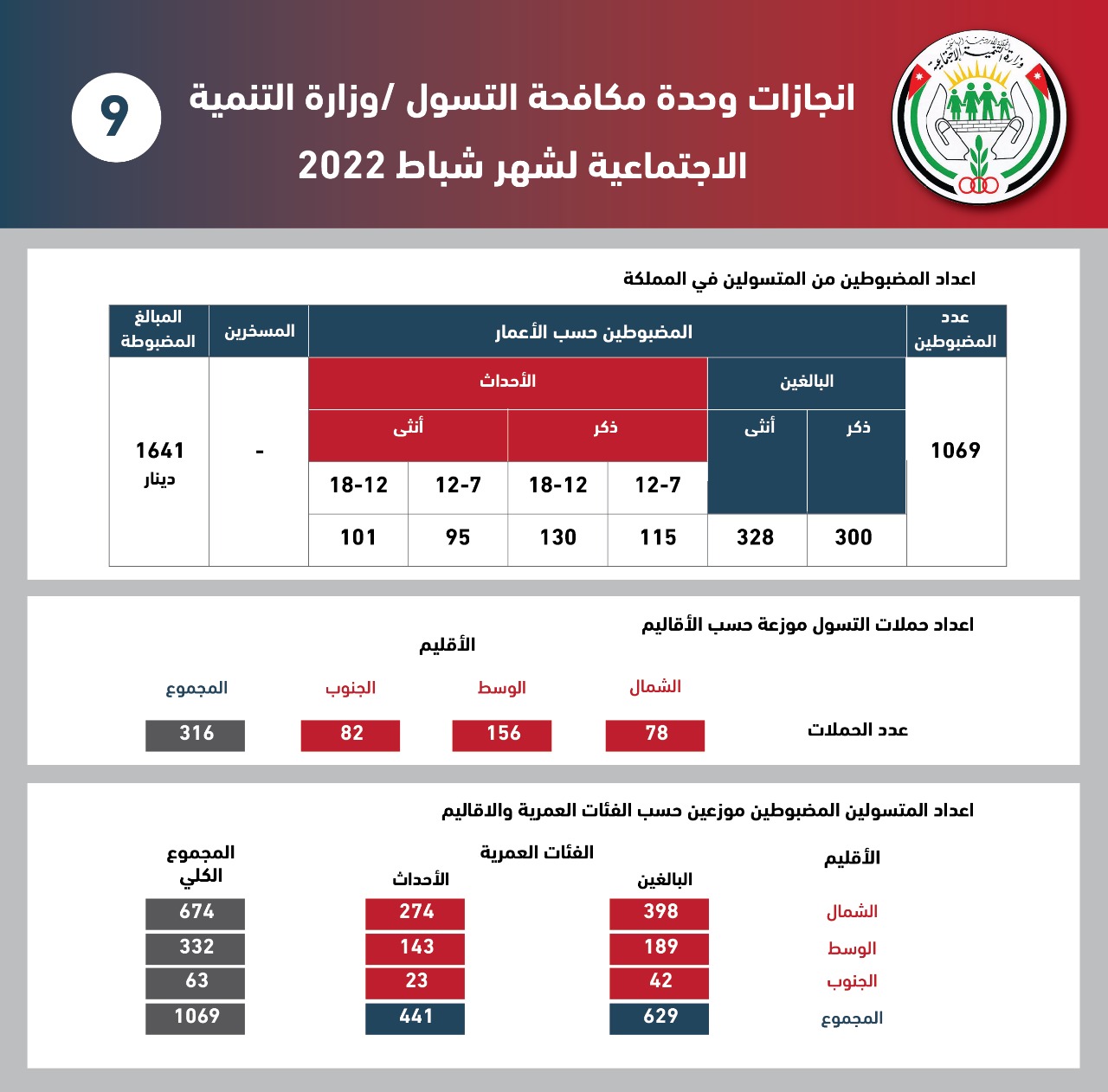 من جانب آخر، أشارت الوزارة الى أن كوادر مديرية مكافحة التسول ضبطت 1069 متسولا، وأجرت 316 حملة، فيما بلغ مجموع المبالغ المضبوطة 1641 دينارا، كما أجرت الوزارة 527 دراسة متعلقة بحالات الأحداث، إذ دخل إليها 219 حدثا خلال شباط الماضي، وأجرت 1463 دراسة لطلب الحصول على إعفاء من رسوم تصريح العمل.
