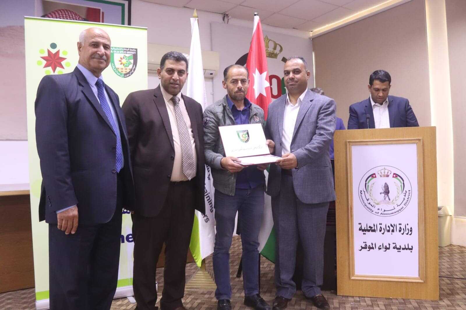 وجرى تخريج المشاركين وتسليم الشهادات لهم بحضور نائب رئيس البلدية السيد أيمن القضاة، ومستشار الاتصال والإعلام بوزارة الإدارة المحلية محمد الملكاوي، ومدير المركز الوطني للتدريب وتأهيل المدربين الدكتور جودت الكساسبة ممثل جامعة البلقاء التطبيقية.
