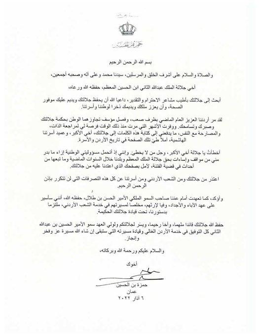 لقد مرّ أردننا العزيز العام الماضي بظرف صعب، وفصل مؤسف تجاوزهما الوطن بحكمة جلالتك وصبرك وتسامحك. ووفرت الأشهر التي مرت منذ ذلك الوقت فرصة لي لمراجعة الذات، والمصارحة مع النفس، ما يدفعني إلى كتابة هذه الكلمات إلى جلالتك، أخي الأكبر، وعميد أسرتنا الهاشمية، آملاً طيّ تلك الصفحة في تاريخ الأردن والأسرة.