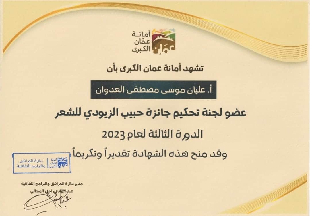 ومن ضمن المكرمين بشهادة عضو تحكيم جائزة حبيب الزيودي الشاعر عليان العدوان رئيس اتحاد الكتاب والأدباء الاردنيين وتعتبر هذه الجائزة رسمية وطنية و تقوم على تنفيذ برامجها أمانة عمان الكبرى