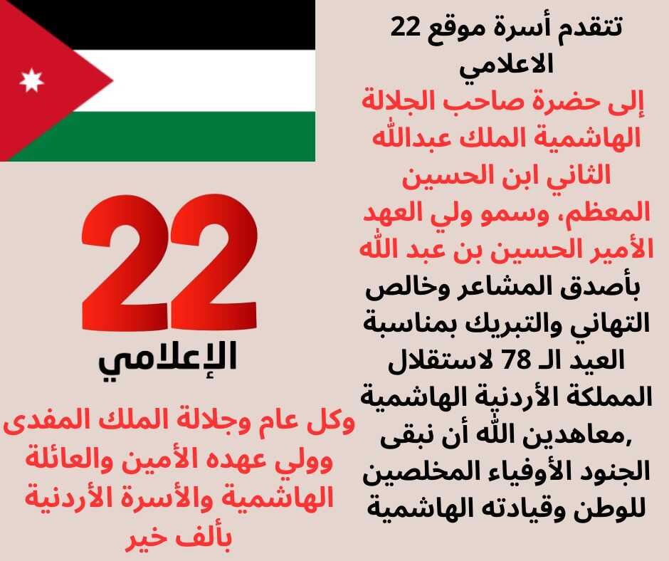 22 الاعلامي - اسرة موقع 22 الاعلامي يتقدمون بأحر التهاني والتبريكات من جلالة الملك عبدالله الثاني بن الحسين المعظم وولي عهده الأمين صاحب السمو الملكي الأمير الحسين بن عبدالله الثاني والأسرة الهاشمية والشعب الأردني بمناسبة عيد الاستقلال 78.