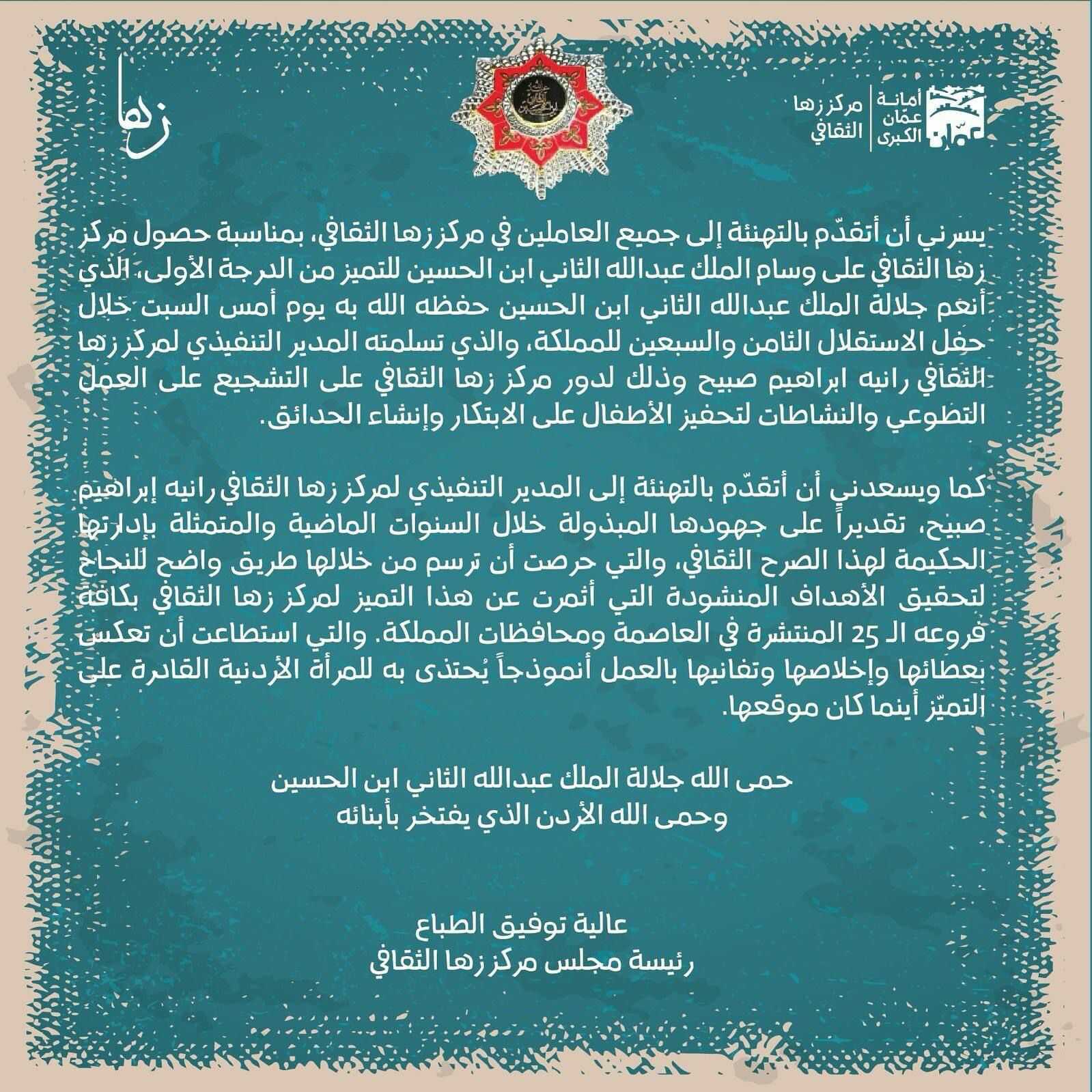 22 الاعلامي - صاحبة السمو الملكي الأميرة عالية كريمة توفيق الطباع حفظها الله رئيسة مجلس مركز زها الثقافي تُهنئ المدير التنفيذي رانيه صبيح وكوادر مركز زها الثقافي بمناسبة حصول مركز زها الثقافي على وسام الملك عبدالله الثاني ابن الحسين للتميز من الدرجة الأولى، الذي أنعم جلالة الملك عبدالله الثاني ابن الحسين حفظه الله به يوم أمس السبت خلال حفل الاستقلال الثامن والسبعين للمملكة.