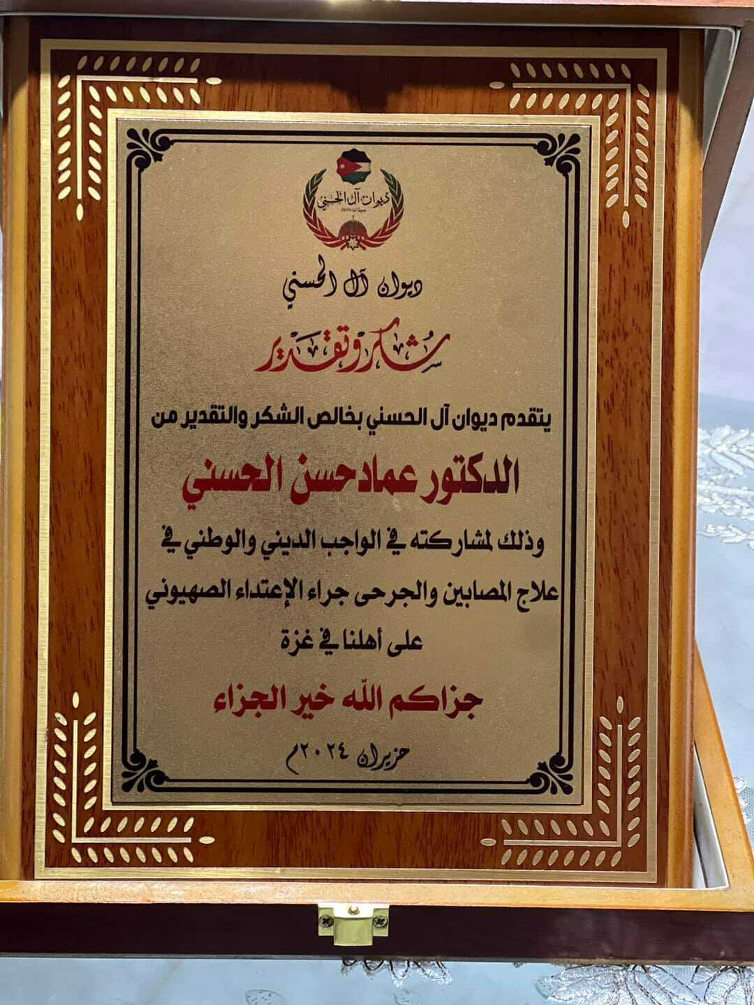 22 الاعلامي - محمد الحسني - مندوبا عن رئيس ديوان آل الحسني كرم نائب الرئيس الاستاذ اسماعيل الحسني وأمين السر الاستاذ محمود الحسني، الدكتور عماد الحسني عقب عودته إلى أرض الوطن بعد قضاء 148 يوما ضمن الكادر الطبي المتطوع لعلاج المصابين والجرحى في قطاع غزة.