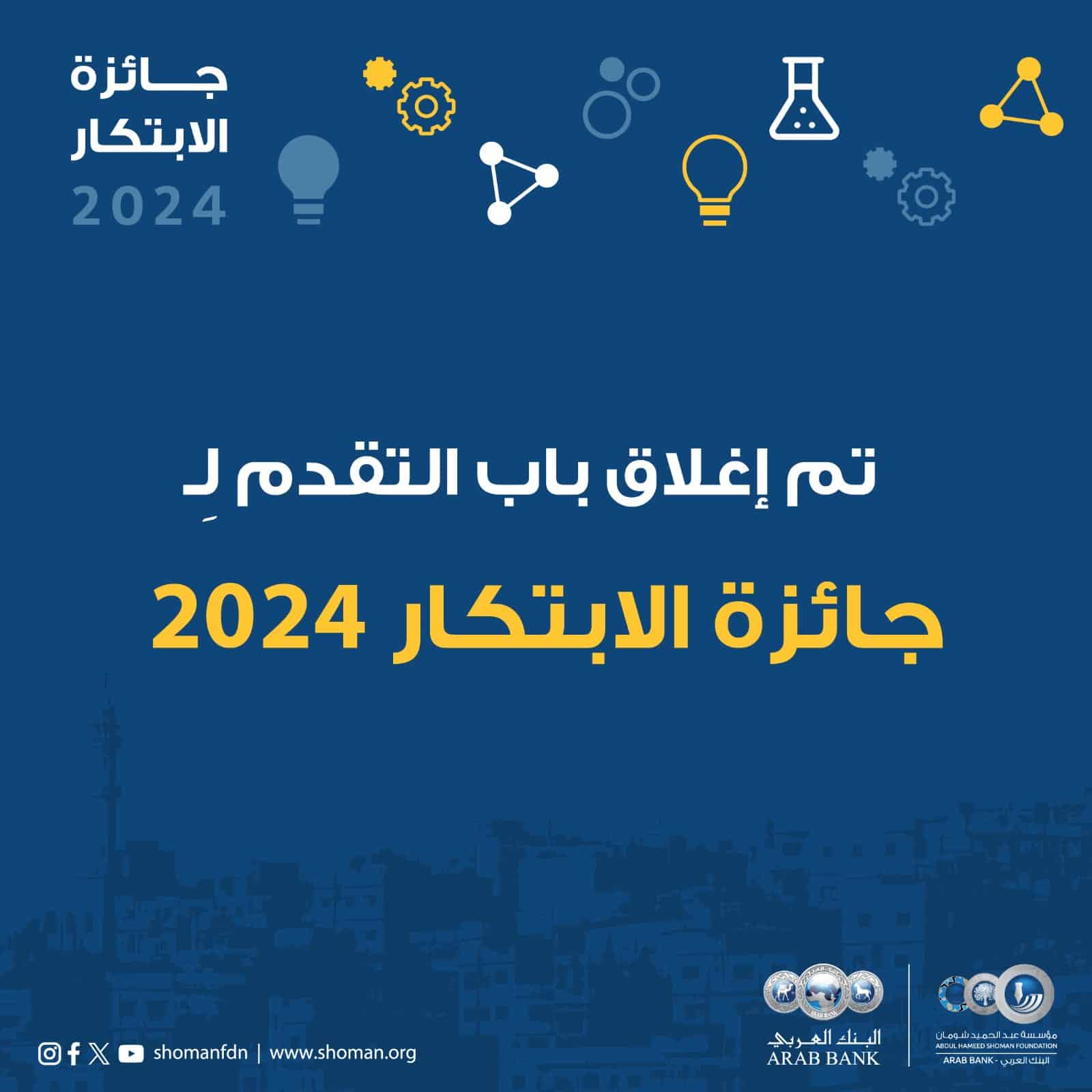 أعلنت مؤسسة عبد الحميد شومان، عن إغلاق باب التقدم لجائزة عبد الحميد شومان للابتكار بنسختها الثالثة للعام 2024.