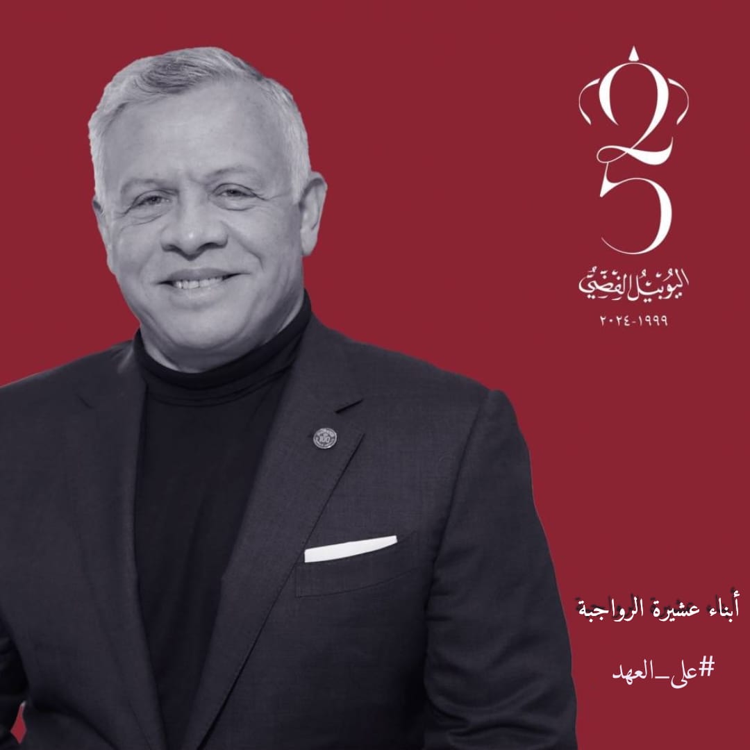 22 الاعلامي - تتقدم أبناء عشيرة الرواجبة ممثلة بمختارها السيد عبد الكريم محمد الرواجبة، بأسمى آيات التهنئة والتبريك إلى حضرة صاحب الجلالة الهاشمية الملك عبدالله الثاني ابن الحسين المعظم وجلالة الملكة رانيا العبدلله المعظمة، وسمو الأمير الحسين بن عبدالله الثاني، ولي العهد المعظم، وللعائلة الهاشمية والأسرة الأردنية، بمناسبة ذكرى تسلم جلالته سلطاته الدستورية، التي تتزامن إقامتها مع عيد الجلوس الملكي الـ 25 ومناسبة ذكرى الثورة العربية الكبرى ويوم الجيش.