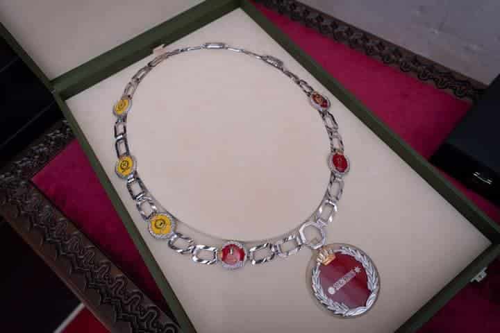 وجاء تسليم القلادة خلال زيارة جلالة الملك إلى صرح الشهيد بمناسبة ذكرى الثورة العربية الكبرى ويوم الجيش، بحضور سمو الأمير فيصل بن الحسين، ورئيس الوزراء الدكتور بشر الخصاونة.