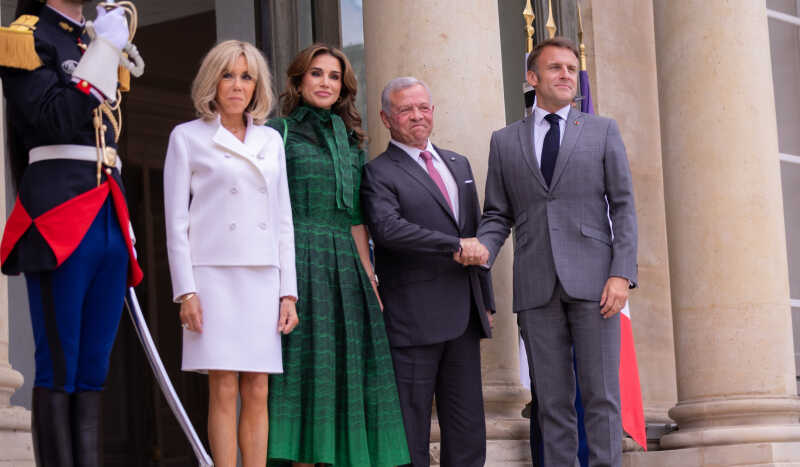 ولدى وصول جلالة الملك، ترافقه جلالة الملكة رانيا العبدالله إلى قصر الإليزيه، كان الرئيس الفرنسي والسيدة عقيلته في مقدمة المستقبلين.