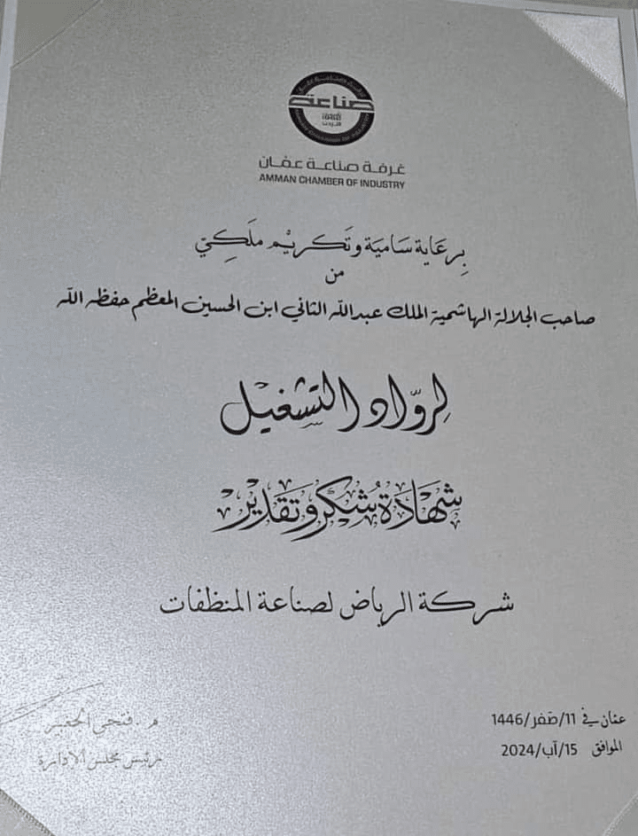 يتقدم عبدالهادي عبيدات بأجمل التهاني والتبريكات من السادة شركة الرياض لصناعة المنظفات بمناسبة التكريم الملكي باعتبارها واحدة من كبرى الشركات الأردنية الرائدة في تشغيل الأيدي العاملة الأردنية، ممثلة برئيس هيئة المديرين الشيخ حاتم الخوام.