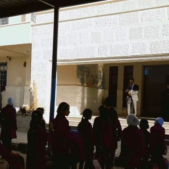 وشهد العبيدات فعاليات الطابور الصباحي والإذاعة المدرسية في مدرسة أسماء بنت أبي بكر الثانوية المختلطة .