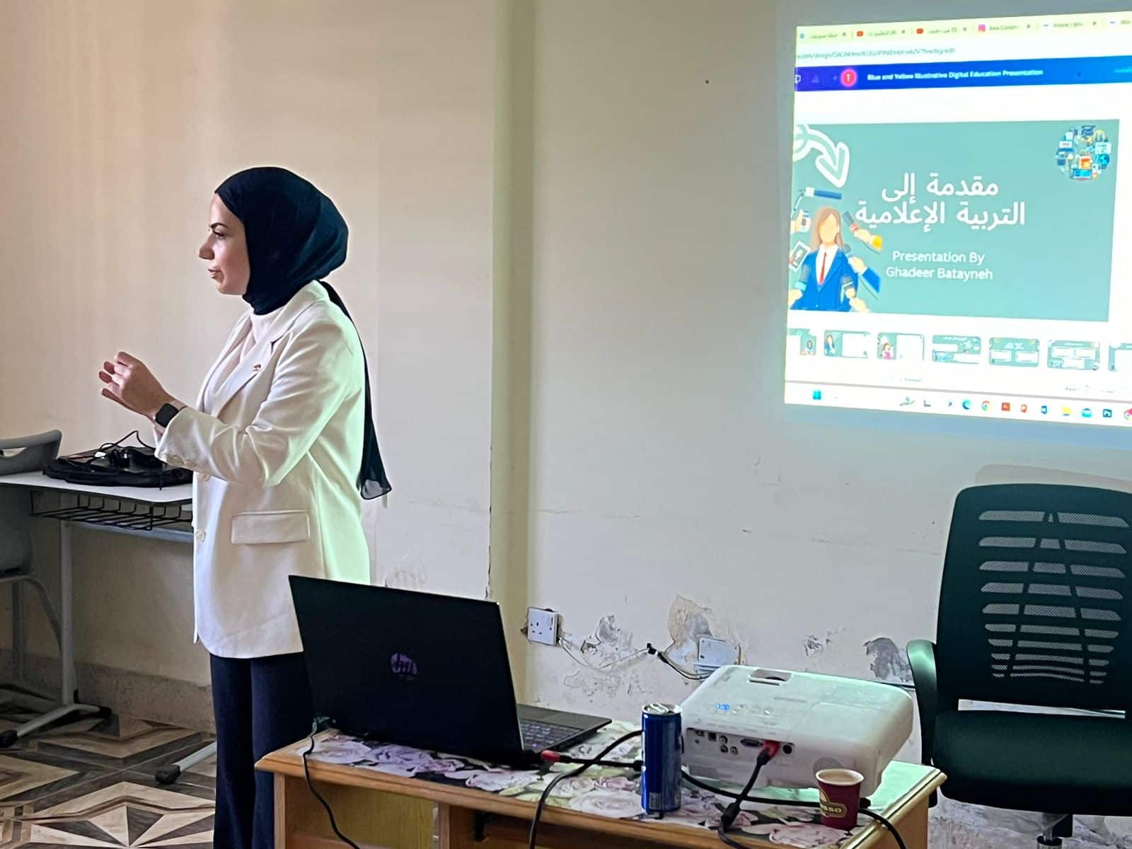 مع المدربة غدير بطانية حيث تأتي أهمية النشاط إلى معرفة المشاركات بالاعلام ودوره في صقل شخصية المشاركين من خلال معرفته لمجموعة من المعارف والحقائق ذات الصلة بالإعلام مثل مفاهيم الخبر والتحرير والنشر والتوزيع والإشاعه والتنمر وغسل الدماغ وغيرها .