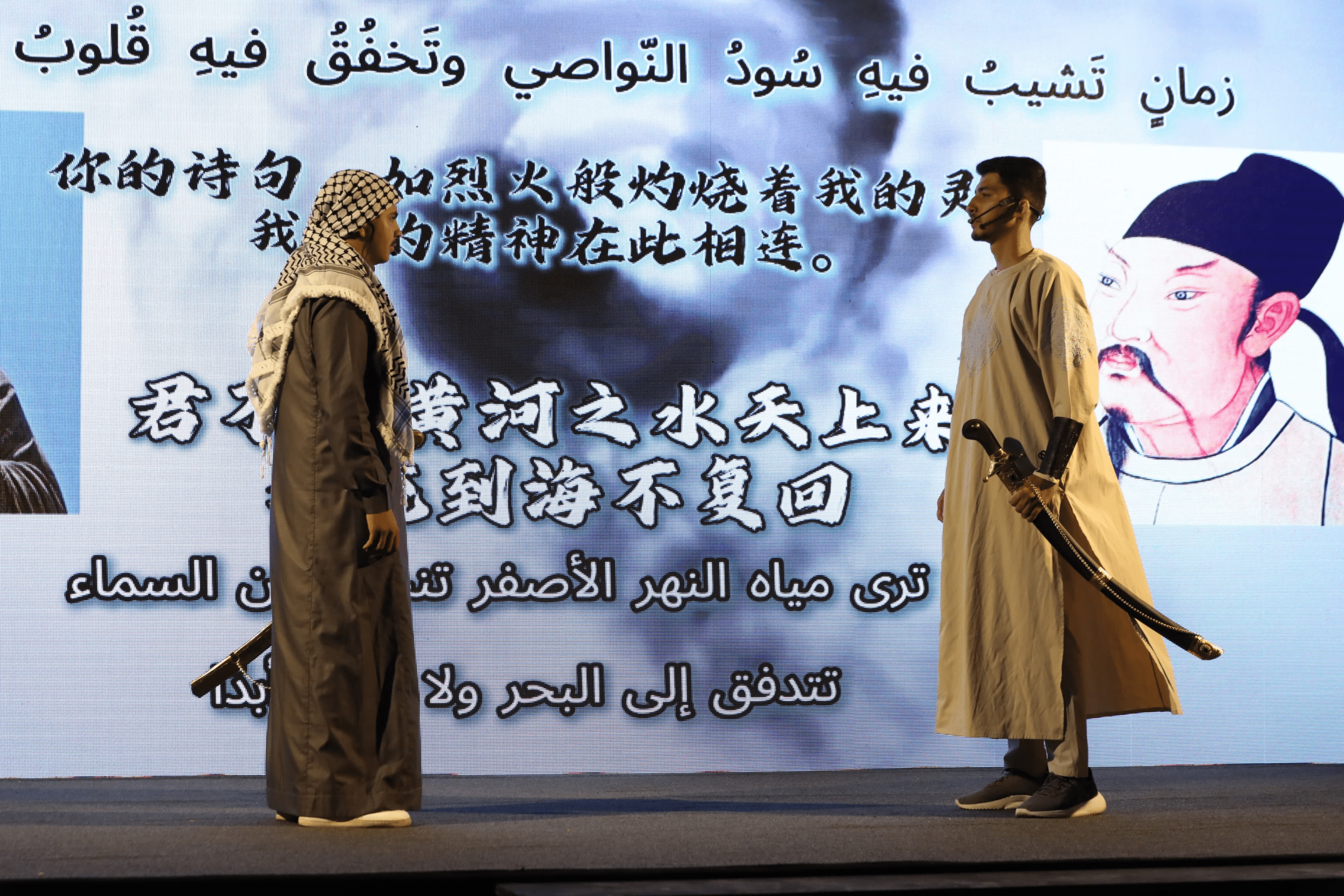 وتميزت الأمسية بما لمسه الحضور وتفاعلوا معه من الحوار العابر للزمن بين الشعراء الصينيين والعرب، حيث تم تجسيد التبادل الثقافي بين الحضارتين الصينية والعربية ، كحضارتين عظيمتين، من خلال عرض مسرحي، تناول المشاعر المشتركة والتفاعل الثقافي العميق بينهما، وجاء ذلك متوافقًا مع موضوع العيد، لإبراز الروابط الإنسانية والثقافية المشتركة.