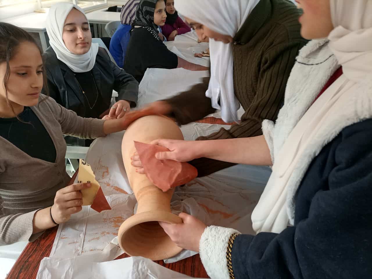 وقامت المدربة شذى بني موسى بتعليم المشاركات على كيفية حف الفخار بورق الزجاج وتنعيمها وتنظيف الزوائد الموجودة على القطعة وكذلك كيفية مزج الألوان واستخدامها في الرسم .
