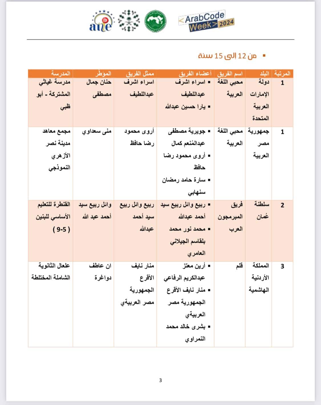 22 الاعلامي- حصد الفريق الذهبي (قَلَم) المكون من الطالبات (أرين الرفاعي،بشرى النمراوي،منار المصري) من مدرسة علعال الثانوية الشاملة المختلطة التابعة لمديرية التربية والتعليم للواء قصبة بإشراف المعلمة آن دواغرة على المركز الثالث على مستوى الوطن العربي في مسابقة الأسبوع العربي للبرمجة عن الفئة العمرية من ١٢- ١٥ سنة.