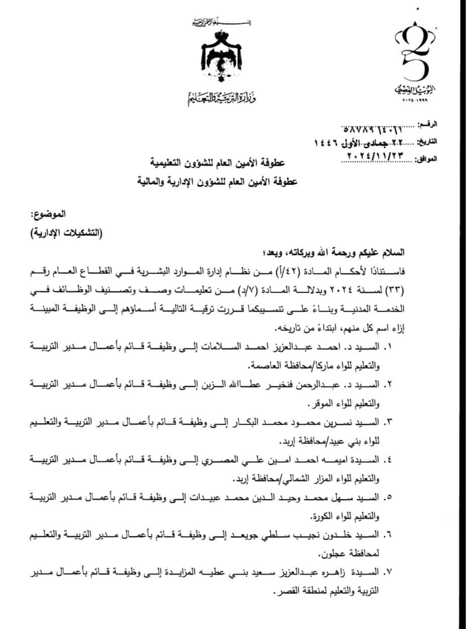 هنيئًا لكم ثقة معالي الوزير ؛ و الأمناء العامين للوزارة - عطوفة الدكتور نواف العجارمة الأكرم - الأمين العام للشؤون التعليمية - ، وعطوفة السيدة. سحر الشخاتره الأكرم - الأمين العام للشؤون الإدارية والمالية -.