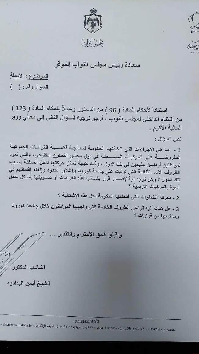 22 الاعلامي - وجه النائب الدكتور أيمن البدادوة عدة أسئلة نيابية هامة لعدد من وزراء حكومة دولة رئيس الوزراء جعفر حسان، وجاءت الأسئلة لوزير النقل ووزير التربية والتعليم والتعليم العالي ووزير المالية.