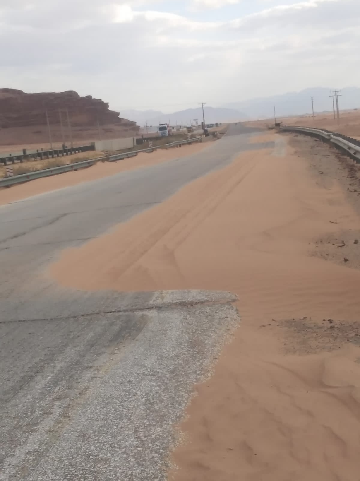آليات وزارة الاشغال العامة و الاسكان تقوم بتنظيف الرمال المتحركة على طريق القويره جسر المطار