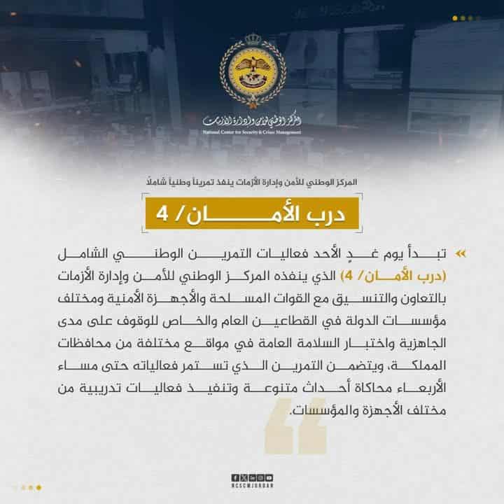 المركز الوطني للأمن وإدارة الأزمات ينفذ تمريناً وطنياً شاملاً (درب الأمان /4)