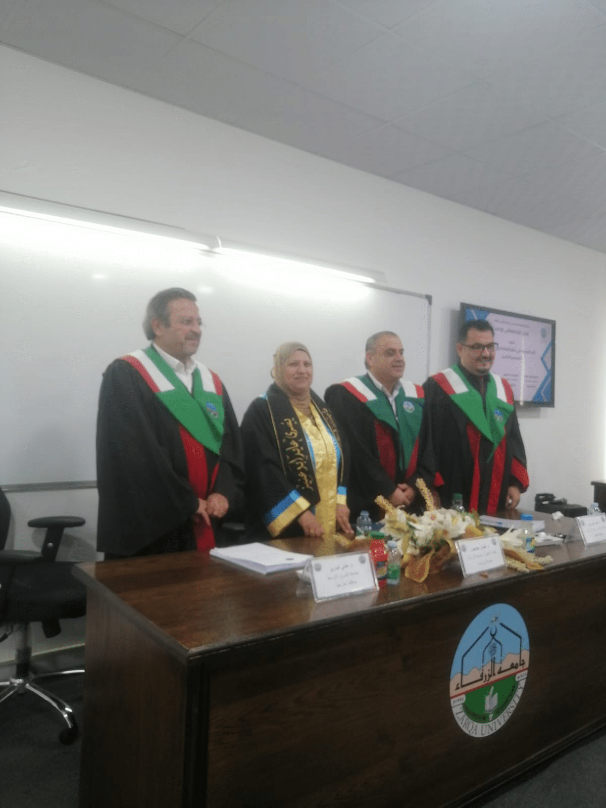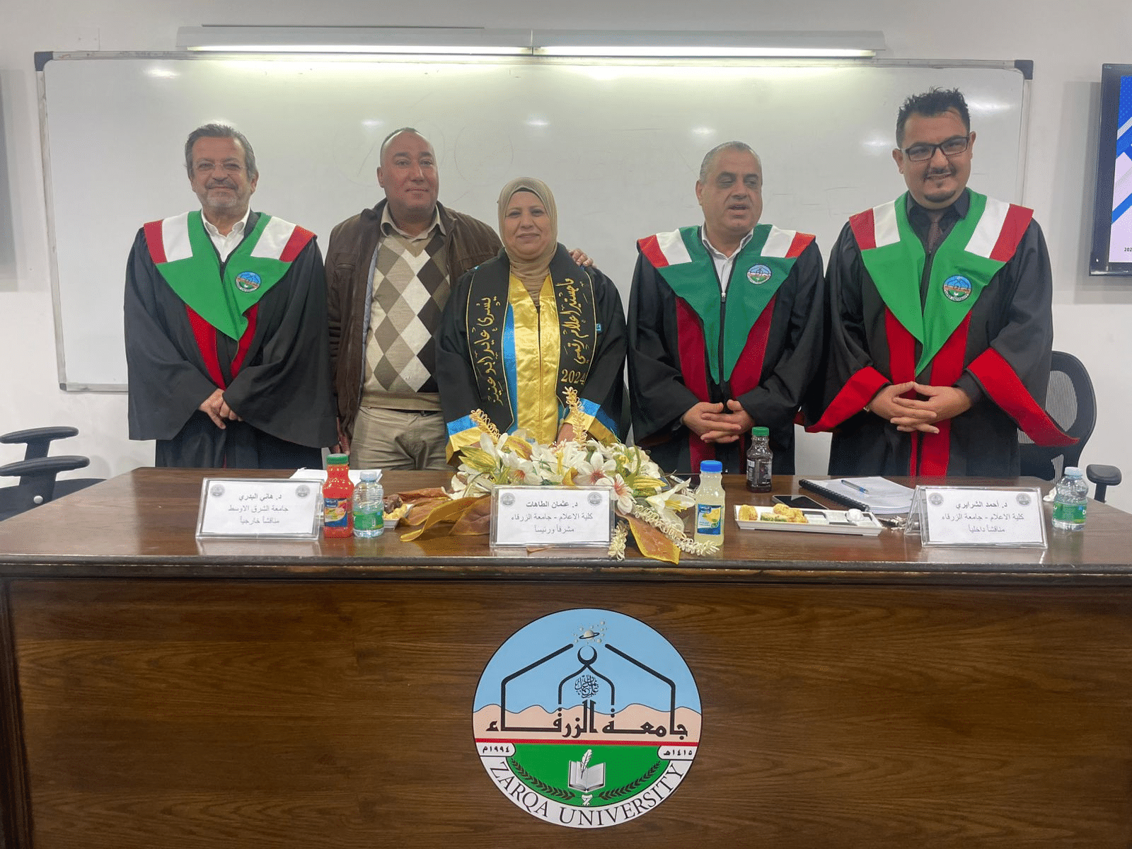 وتألفت لجنة المناقشة من الدكتور عثمان منصور الطاهات مشرفاً،والدكتور أحمد الشرايري مشرفاً داخلياً، والدكتور هاني البدري مشرفاً خارجياً.