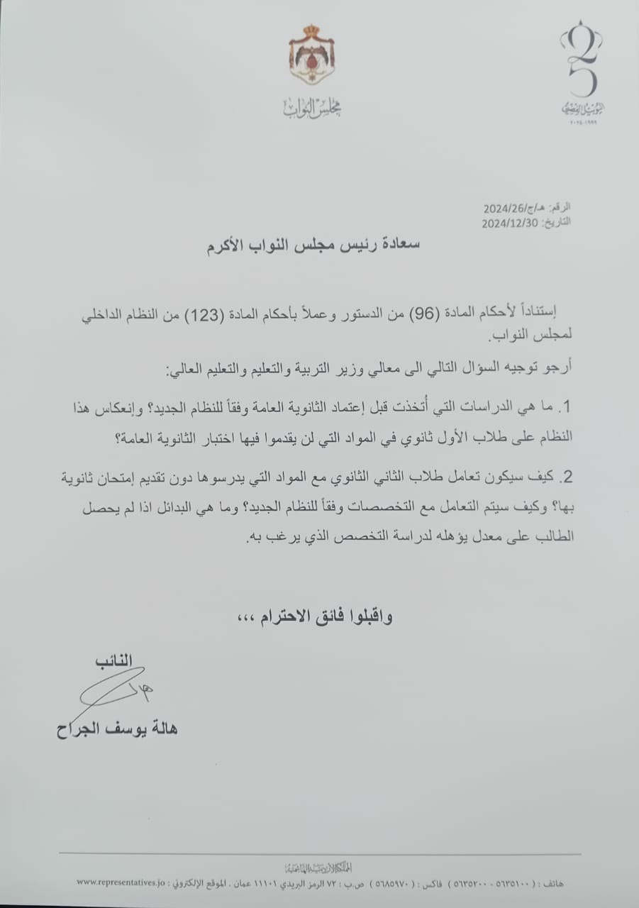 22الاعلامي- وجهت النائب هالة الجراح سؤالَا نيابيَا لوزير التربية والتعليم والتعليم العالي حول الدراسات التي اتخذت قبل إعتماد الثانوية العامة وفقَا للنظام الجديد، وما إنعكاس هذا النظام على طلاب الأول ثانوي في المواد التي لن يقدموا فيها اختبار الثانوية العامة.