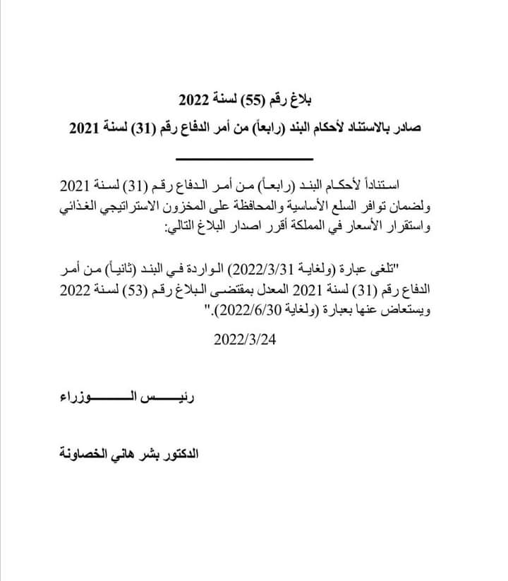 أصدر رئيس الوزراء الدكتور بشر الخصاونة البلاغ رقم (55) لسنة 2022م، الذي تمَّ بموجبه تمديد العمل بأمر الدِّفاع رقم (31) لسنة 2021، المتعلِّق بتحديد الحدَّ الأعلى لتكاليف أجور نقل البضائع المستوردة إلى المملكة، حتى 30 حزيران 2022م.