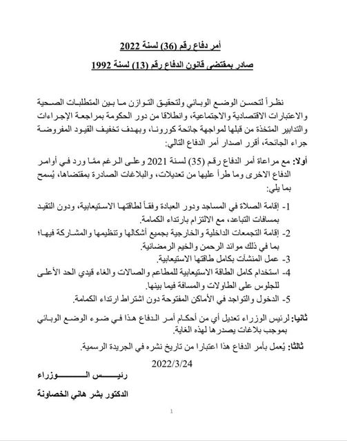 رئيس الوزراء الدكتور بشر الخصاونة يُصدِر أمر الدِّفاع رقم (36) لسنة 2022م، بهدف تخفيف القيود المفروضة جرَّاء جائحة كورونا. وفيما يلي نصُّه: