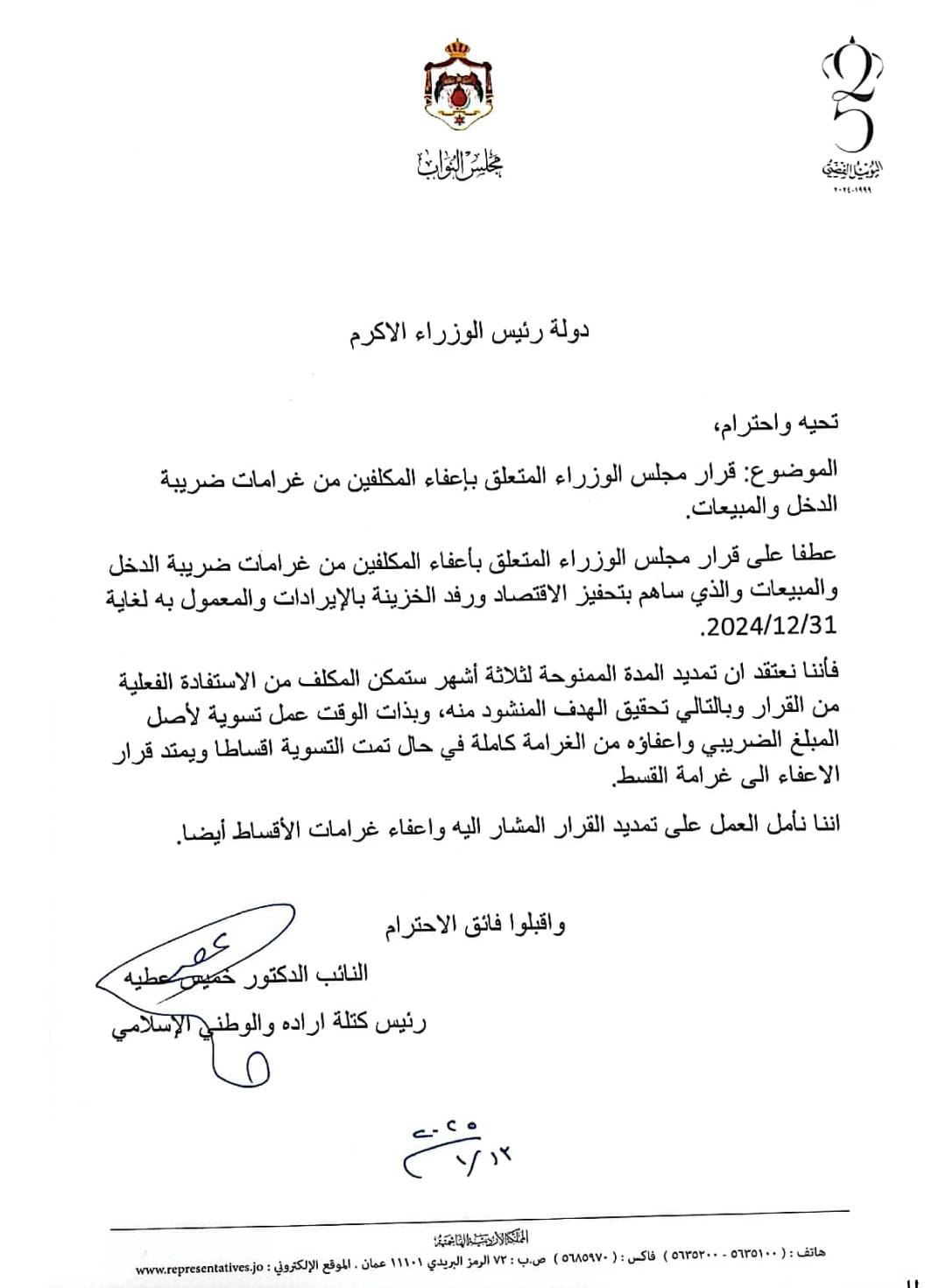 عطفا على قرار مجلس الوزراء المتعلق بأعفاء المكلفين من غرامات ضريبة الدخل والمبيعات والذي ساهم بتحفيز الاقتصاد ورفد الخزينة بالإيرادات والمعمول به لغاية 31/12/2024.
