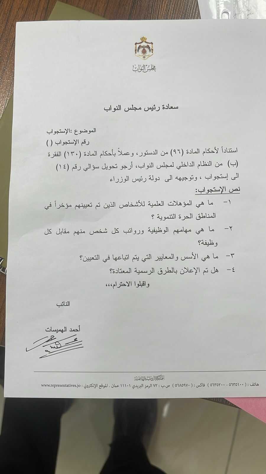 22 الاعلامي - حول النائب أحمد الهميسات سؤاله رقم ( 14 ) إلى استجواب ووجهه لدولة رئيس الوزراء، وحمل الاستجواب الأسئلة التالية: