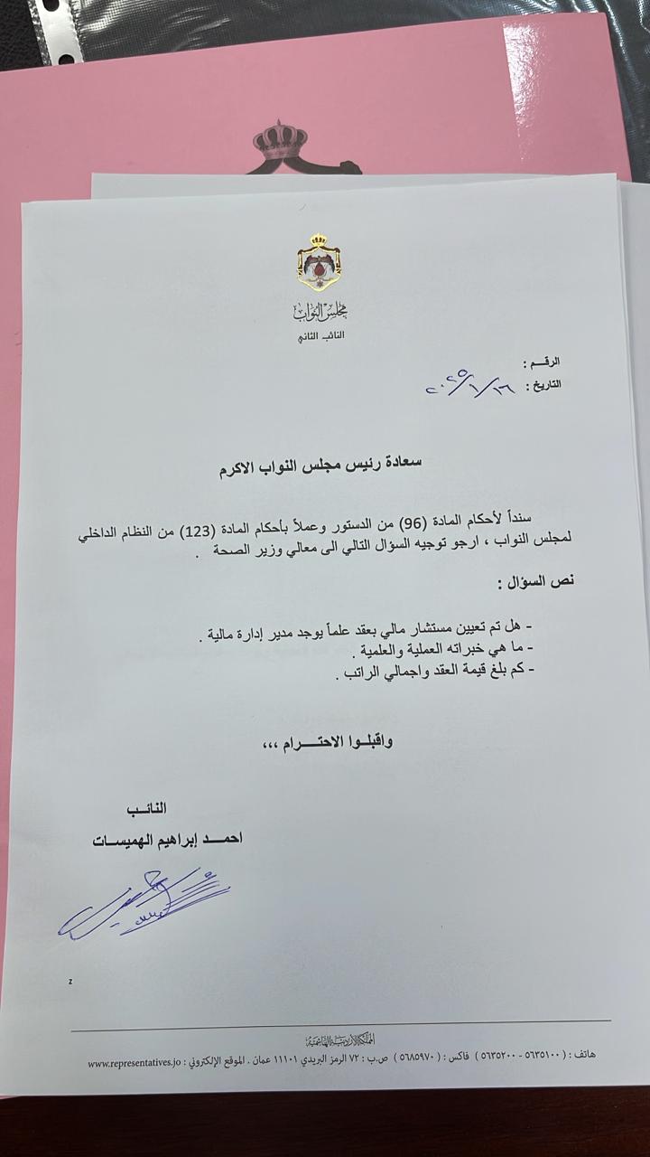 كما وجه النائب الهميسات سؤالاً لوزير الصحة: