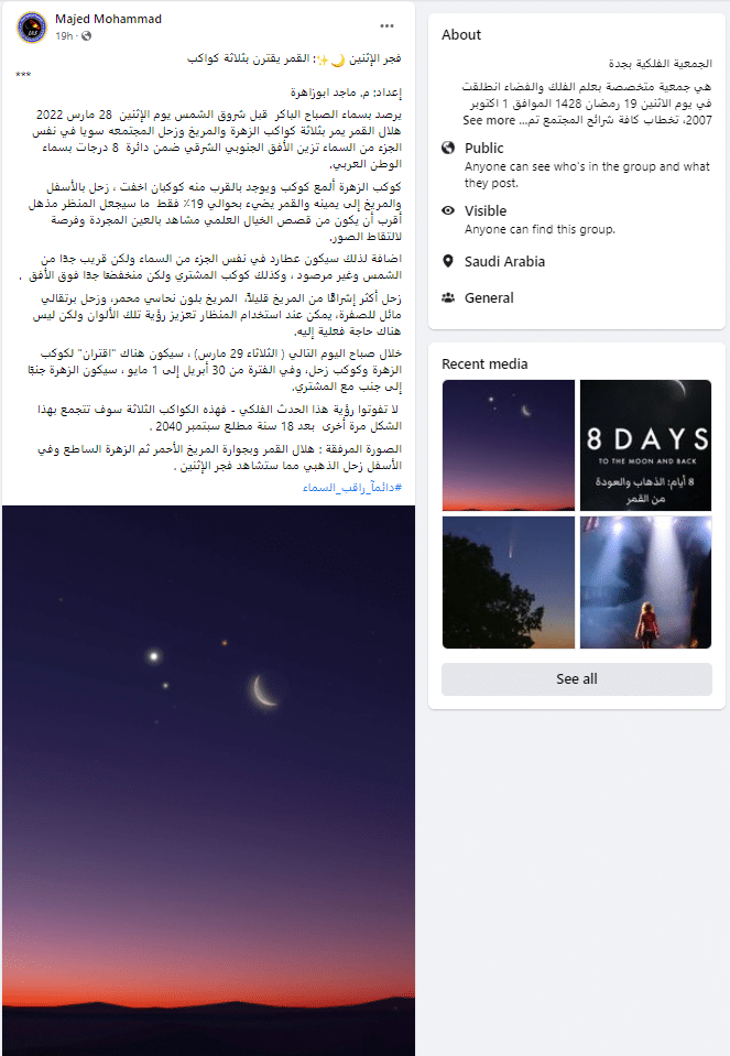وفي وقت سابق، كانت الجمعية الفلكية بجدة قد قالت: "يرصد بسماء الصباح الباكر قبل شروق الشمس يوم الإثنين 28 مارس 2022 هلال القمر يمر بثلاثة كواكب الزهرة والمريخ وزحل المجتمعة سويا في نفس الجزء من السماء تزين الأفق الجنوبي الشرقي، ضمن دائرة 8 درجات بسماء الوطن العربي".