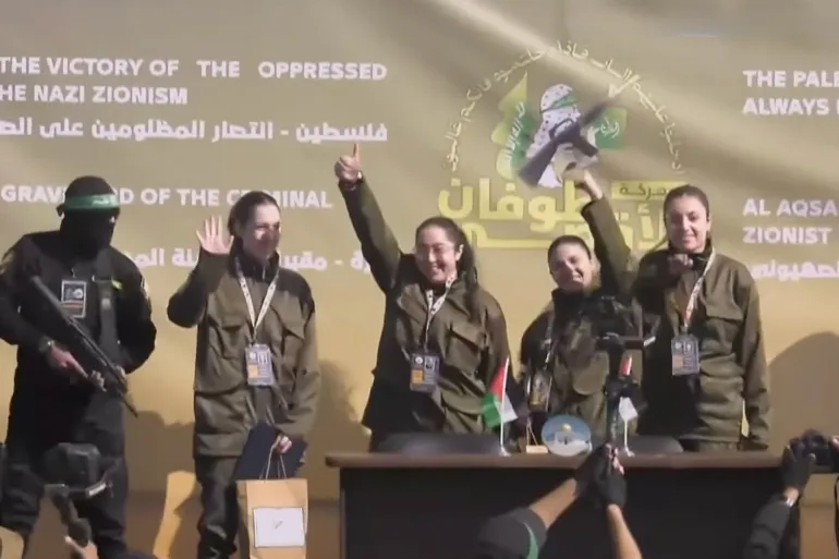 وظهرت المجندات جانب إلى عناصر من المقاومة على منصة أقيمت في الميدان، وشهدت توقيع اتفاق للتسليم بين ممثل للقسام وآخر من الصليب الأحمر.