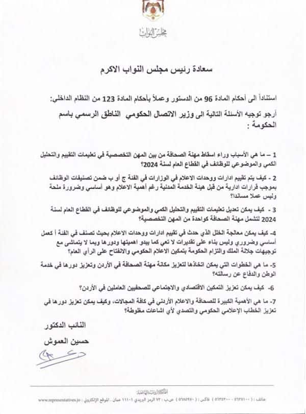 22 الاعلامي - وجّه النائب الدكتور حسين العموش مجموعة من الأسئلة النيابية إلى وزير الاتصال الحكومي الناطق الرسمي باسم الحكومة، تتعلق بمكانة مهنة الصحافة في الأردن ودورها في خدمة الوطن والدفاع عن رسالته، وذلك استنادًا إلى أحكام المادة 96 من الدستور والمادة 123 من النظام الداخلي لمجلس النواب.