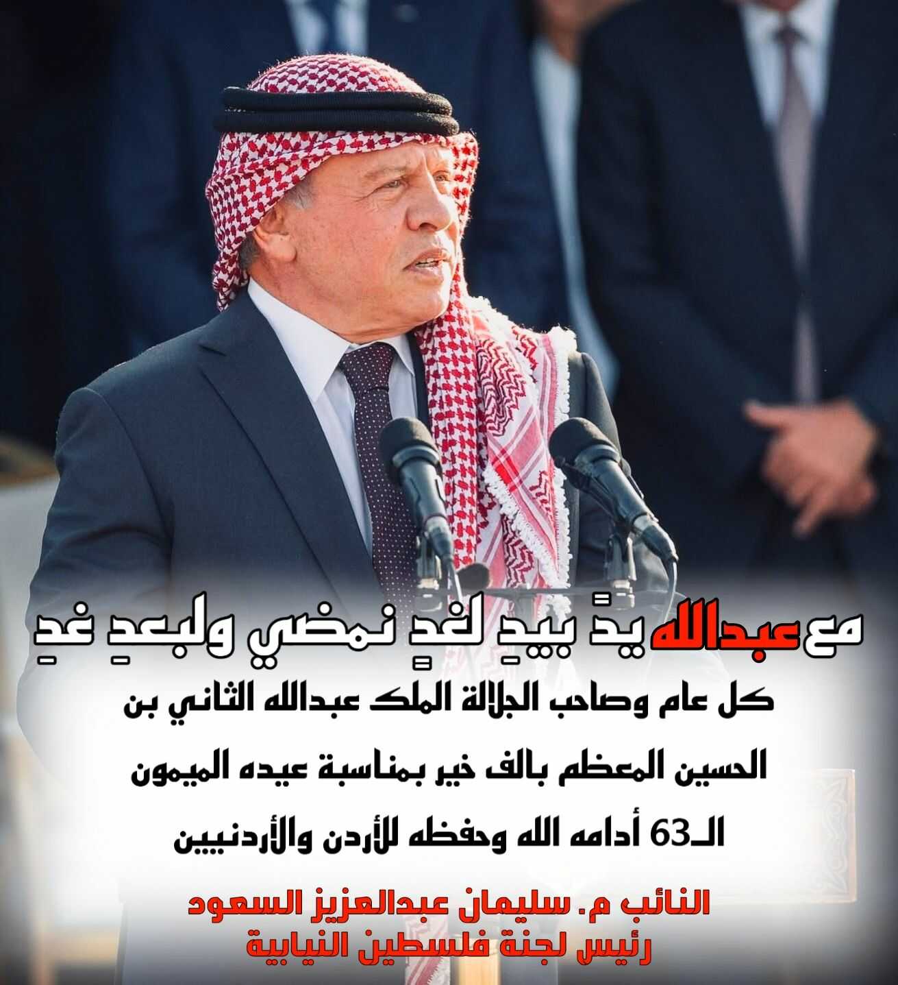 22 الاعلامي - يتقدم سعادة النائب م.سليمان عبد العزيز السعود رئيس لجنة فلسطين النيابية ممثلًا عن أبناء الدائرة الثانية في عمان أسمى آيات التهنئة والتبريكات إلى حضرة صاحب الجلالة الهاشمية الملك عبدالله الثاني ابن الحسين بمناسبة عيد ميلاده الثالث والستين، وفي هذه المناسبة نرجو من الله العلي القدير أن يمدَّ جلالته بوافر الصحة والعافية.