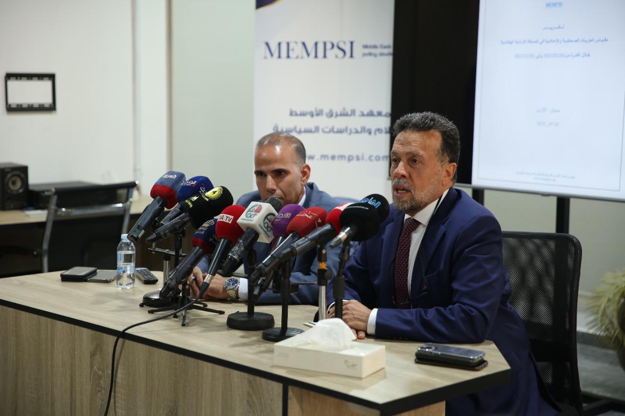 الحرية نسبية من وجهة نظر الصحفيين والإعلاميين وعالية من وجهة نظر رؤساء التحرير ومدراء المؤسسات الإعلاميةارتفاع مستوى الحريات الإعلامية كما أدلى بها رؤساء التحرير ومدراء المؤسسات الإعلامية بشكل ملحوظ حيث وصلت إلى (67,5%)، وهي بذلك تقع ضمن فئة الحريات العاليةمدراء المؤسسات الإعلامية: مستوى الحريات الإعلامية سجل ارتفاعا ملحوظاً حيث بلغت نسبته (67,5%) وبذلك تقع ضمن إطار الحرية العاليةنتائج التقرير شملت 761 صحفياً يعملون في مختلف المؤسسات الإعلامية في الأردننتائج التقرير تؤكد عدم وجود انتهاكات جسيمة تمس الحريات الإعلامية في الأردنتحسن واضح على مستوى الحريات الصحفية في الأردن خلال العام 2021 وهي ضمن الحرية النسبية وظاهرة تستحق المزيد من التحليل والبحث والمتابعة والسعي الجاد لمعالجة بعض الإشكاليات والسعي للوصول إلى الحرية الصحفية الجيدة.معهد الشرق الأوسط للإعلام والدراسات السياسية يشعر ببعض الارتياح للتقدم الذي حصل على مستوى الحريات الصحفية خلال عام 2021، ويؤكد بأن هناك العديد من القضايا التي يمكن أن تعالج ادارياً لرفع مستوى سقف الحريات،لم يتم تسجيل أي حالة قتل أو خطف أو تعذيب بين الصحفيين والإعلاميين داخل الأردنلم تسجل حالات تهديد عالية بين الصحفيين في الأردن كالمعاملة القاسية أو التعذيب- البيانات الخاصة برؤساء التحرير ومدراء المؤسسات الإعلامية: العديد من المؤشرات لم يسجل عليها أي انتهاك سيما المؤشرات ذات الوزن الثقيل متمثلة بــ: الإغلاق التام، الإغلاق المؤقت، الرقابة، دور التشريعات بالحد من الحرية (قوانين الترخيص)، مصادرة الآلات والوثائقالاهتمام بتدريب الصحفيين والإعلاميين، وتنمية الثقافة القانونية لديهم، خصوصاً في ظل التطورات التي يشهدها قطاع الإعلام.إيلاء الصحف المطبوعة أهمية خاصة وإيجاد الحلول الناجعة الضامنة لاستمراريتها وديمومة إصدارها، بعيداً عن فكرة المساس بالأمان الوظيفي للعاملين فيها.دعم الإذاعات المجتمعية وتشجيع إنشائها، وكذلك الصحف الإلكترونية.