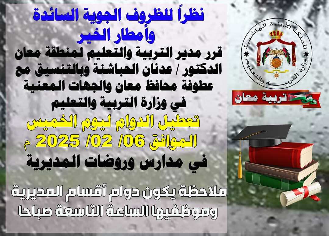 22 الاعلامي - نظراً للظروف الجوية السائدة وأمطار الخير قرر مدير التربية والتعليم لمنطقة معان الدكتور / عدنان الحباشنة وبالتنسيق مع عطوفة محافظ معان والجهات المعنية في وزارة التربية والتعليم