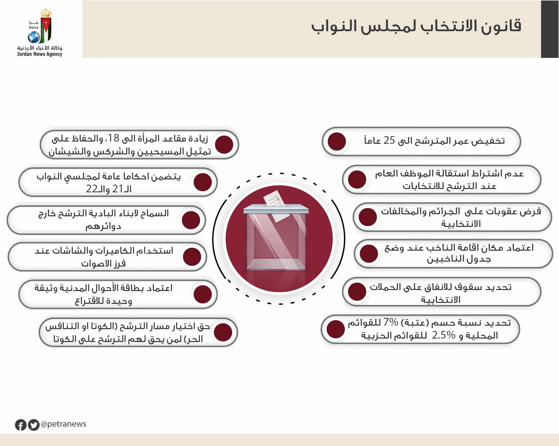 ويُخفّض المشروع، عمر المترشح إلى 25 عامًا، ويعتمد مكان إقامة الناخب عند وضع جدول للناخبين، والبطاقة الشخصية كوثيقة وحيدة للاقتراع، الى جانب عدم اشتراط استقالة موظف القطاع العام المترشح للانتخابات، والنص على سقوف إنفاق على الحملة الانتخابية، وفرض عقوبات على الجرائم والمخالفات الانتخابية المتمثلة باستخدام المال السياسي، والتي تصل عقوبتها إلى سنتين لا يمكن استبدالها بغرامة، وسنة حبس وخمسمائة دينار غرامة لكل ناخب يدعي الأميّة، والحبس سنة مع غرامة تصل إلى خمسة آلاف دينار لكل من ينتحل شخصية غيره، أو يحتفظ ببطاقة أحوال مدنية تعود لناخب آخر، أو يستعمل حقه في الاقتراع أكثر من مرة، أو يعبث بالصناديق، أو يؤثر في إرادة الناخبين، فضلاً عن عقوبات لعدم الإعلان عـن مصادر تمويل القوائم، أو وجود تلاعب بالحسابات أو تزوير بالوثائق، أو وجود مصادر تمويل غير مـشروعة، وقد تصل هذه العقوبات إلى إسقاط عضوية المترشح الذي نجح من القائمة وحرمانه من الترشح في الدورات التالية.