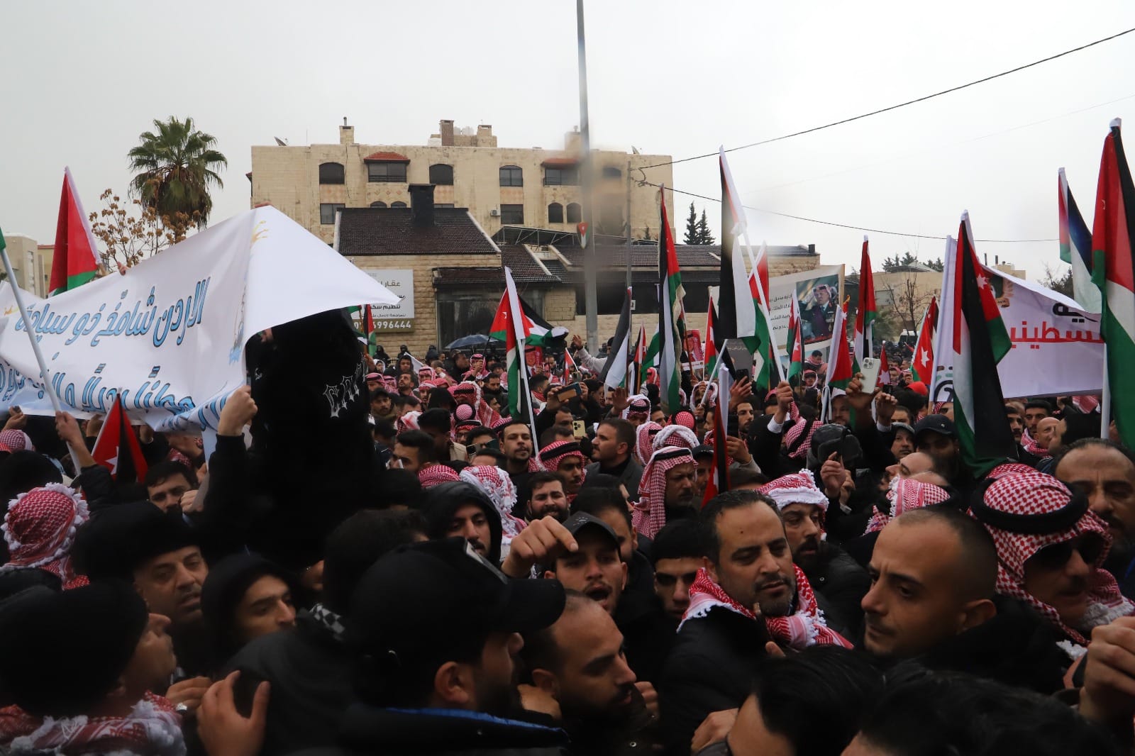 وهتف المئات من الجموع رافضين مشروع التهجير وحل القضية على حساب أي بلد، مؤكدين أن قوة فلسطين من قوة الأردن ويجب أن نتحد في صف الهاشميين لإفشال المخططات لحل القضية على حساب التهجير.