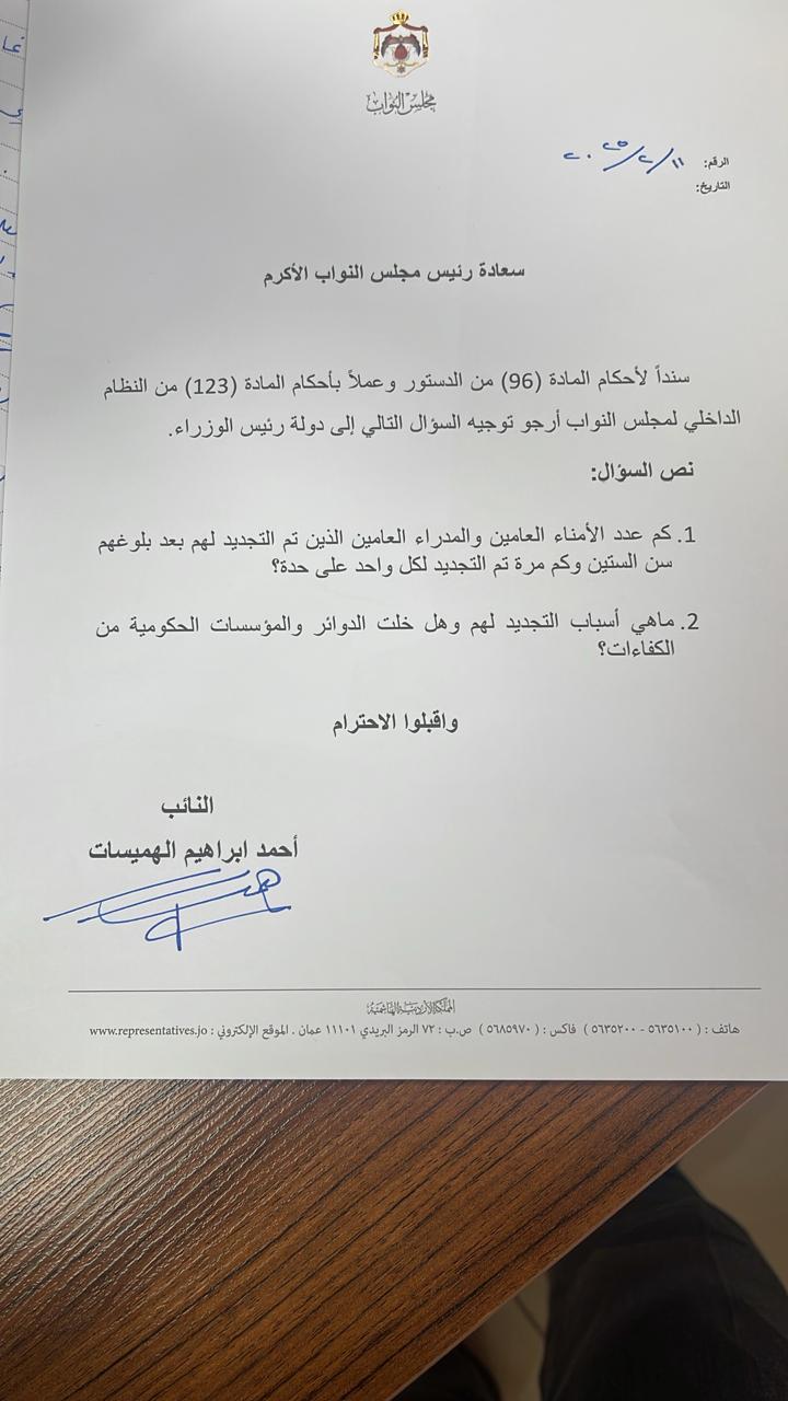 22 الاعلامي - توجه النائب احمد الهميسات بسؤالين لدولة رئيس الوزراء جعفر حسان، حيث اعتاد الهميسات توجيه أسئلته النيابية عن كل كبيرة وصغيرة يلاحظها، وجاءت أسئلة النائب أحمد الهميسات لدولة رئيس الوزراء على النحو التالي: