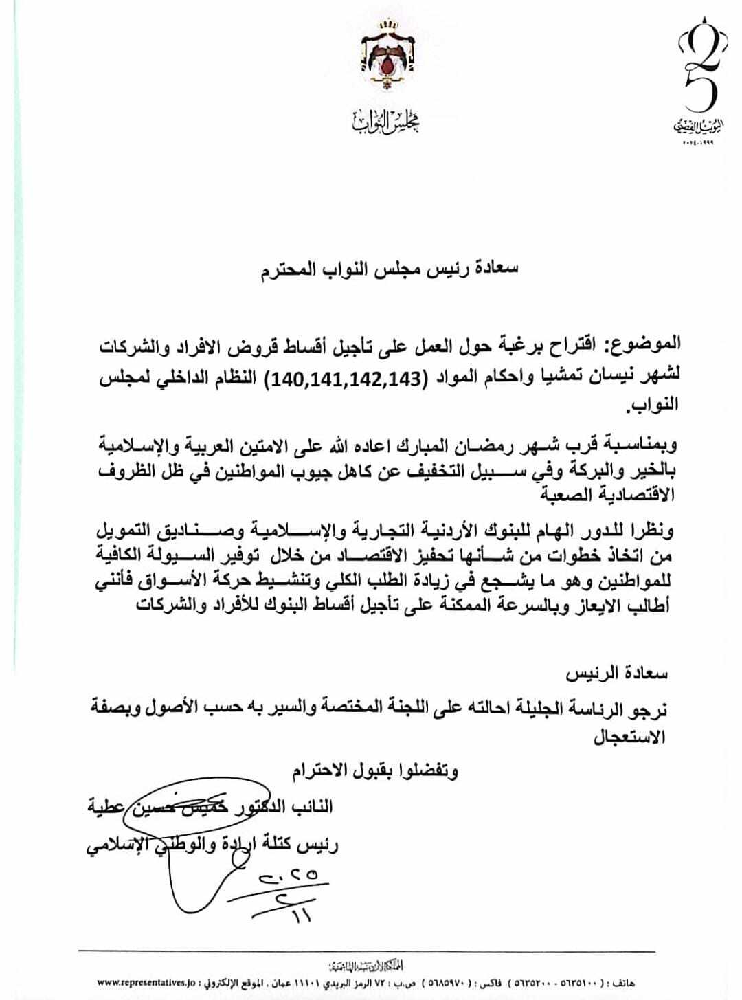 الموضوع: اقتراح برغبة حول العمل على تأجيل أقساط قروض الافراد والشركات لشهر آذار تمشيا واحكام المواد (140,141,142,143) النظام الداخلي لمجلس النواب .