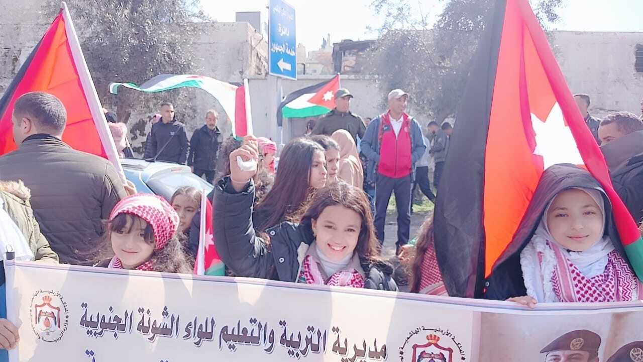 وزين مبنى المديرية ومدارسها وحافلاتها بالأعلام الاردنية وصور جلالة القائد وولي عهده، للتعبير عن فرحتهم وسعادتهم بقدوم سيد البلاد، وتأكيدًا عميقًا على الوحدة الوطنية حول القضايا الوطنية، ورفضًا لأي مساعٍ تستهدف تقويض الهوية الوطنية الأردنية والفلسطينية.