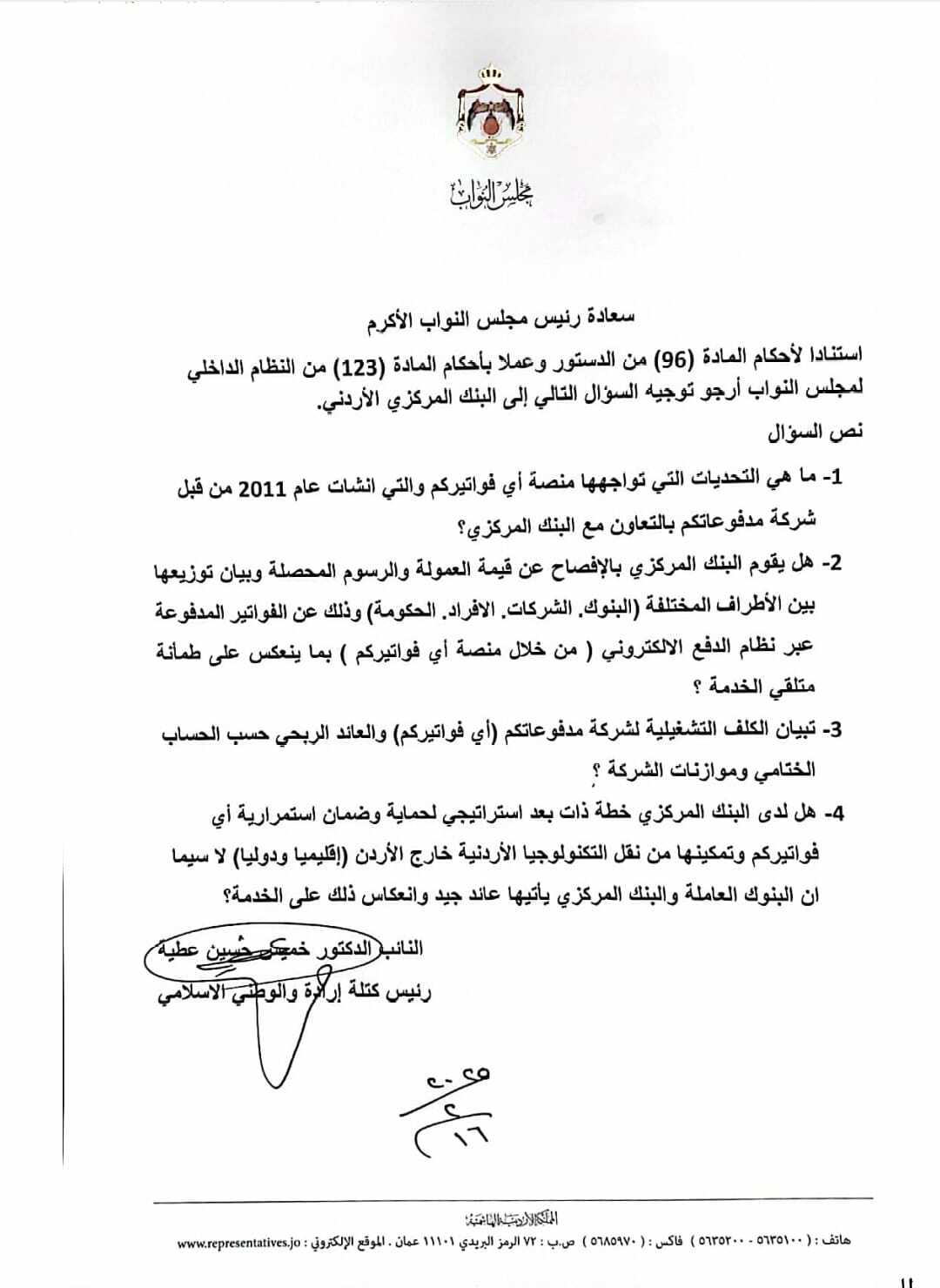 22 الاعلامي - تقدم رئيس كتلة إرادة والوطني الإسلامي النائب الدكتور خميس عطية بسؤال نيابي إلى البنك المركزي الأردني للاستفسار عن قيمة العمولة والرسوم المحصلة وبيان توزيعها وذلك عبر الفواتير المدفوعة عبر نظام الدفع الإلكتروني من خلال منصة اي فواتيركم، وأيضاً طلب عطية تبيان الكلف التشغيلية لشركة مدفوعاتكم اي فواتيركم والعائد الربحي حسب الحساب الختامي وموازنات الشركة، وعن ما إذا كان لدى البنك المركزي خطة ذات بعد استراتيجي لحماية وضمان استمرارية اي فواتيركم.