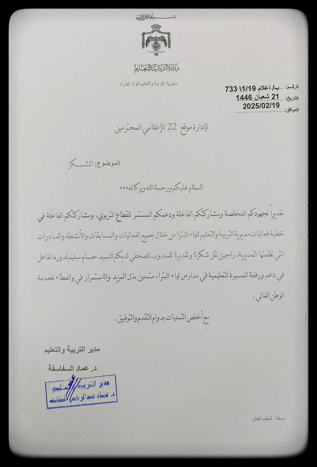 22 الاعلامي – تلقى موقع 22 الاعلامي كتاب شكر من مدير التربية والتعليم للواء البترا على الجهود التي يبذلها كادر الموقع في نشر اخبار ونشاطات المديرية.