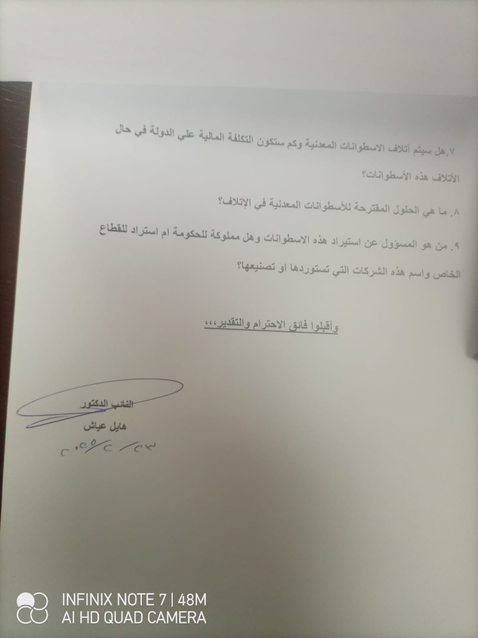 وأشار النائب عياش في سؤاله لوزير الطاقة عن ما إذا تمت دراسة مدى أمان تلك الاسطوانات البلاستيكية، وكم التكلفة المالية لاستبدال الاسطوانات الحالية مقابل أخرى بلاستيكية، ومن هو المسؤول عن استيراد تلك الاسطوانات البلاستيكية.