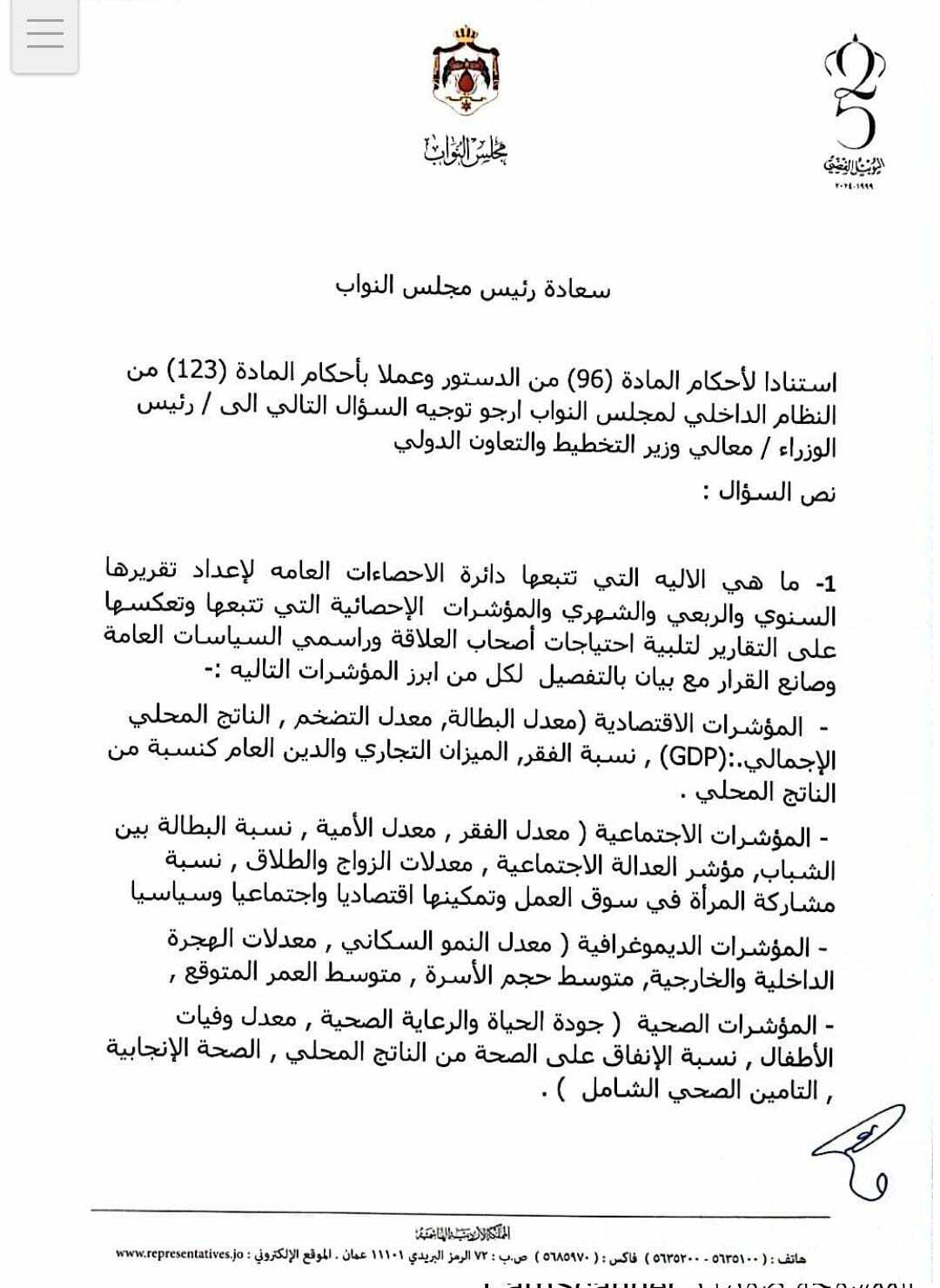 22 الاعلامي - وجه رئيس كتلة إرادة والوطني الإسلامي الدكتور النائب خميس عطية سؤالاً نيابياً لدولة رئيس الوزراء جعفر حسان ووزير التخطيط والتعاون الدولي معالي زينة طوقان عن ما هي الآلية التي تتبعها دائرة الإحصاءات العامة لإعداد تقريرها السنوي وعن المؤشرات الاجتماعية مثل مؤشر العدالة ومعدلات الزواج والطلاق، وأيضاً عن المؤشرات الاقتصادية مثل معدل البطالة ونسبة الفقر والدين العام.