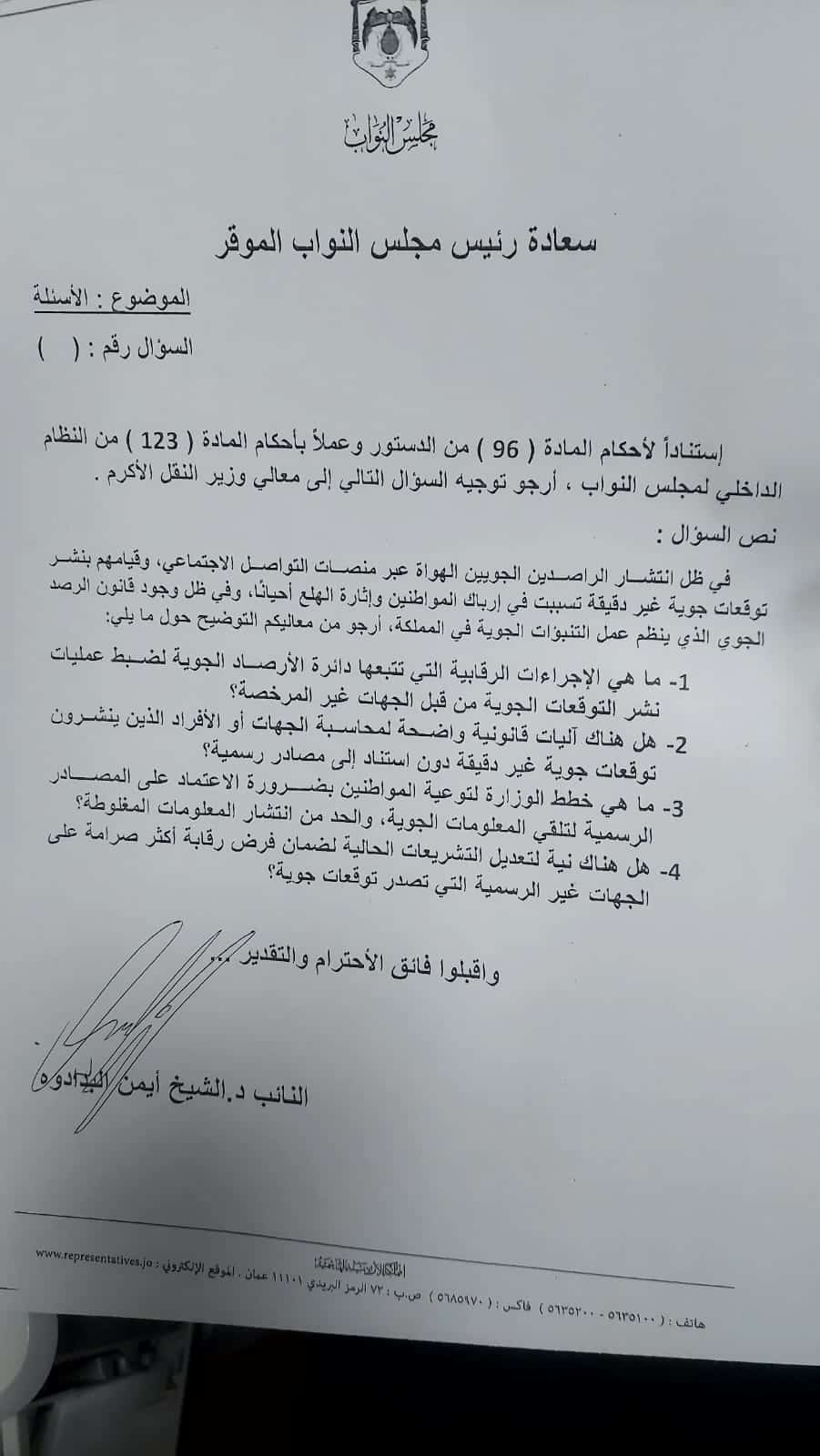 بعد تضارب تنبؤات الطقس الأخيرة وارباك المواطنين، البدادوة يسأل وزير النقل عن وجود آلية لمحاسبة الراصدين
