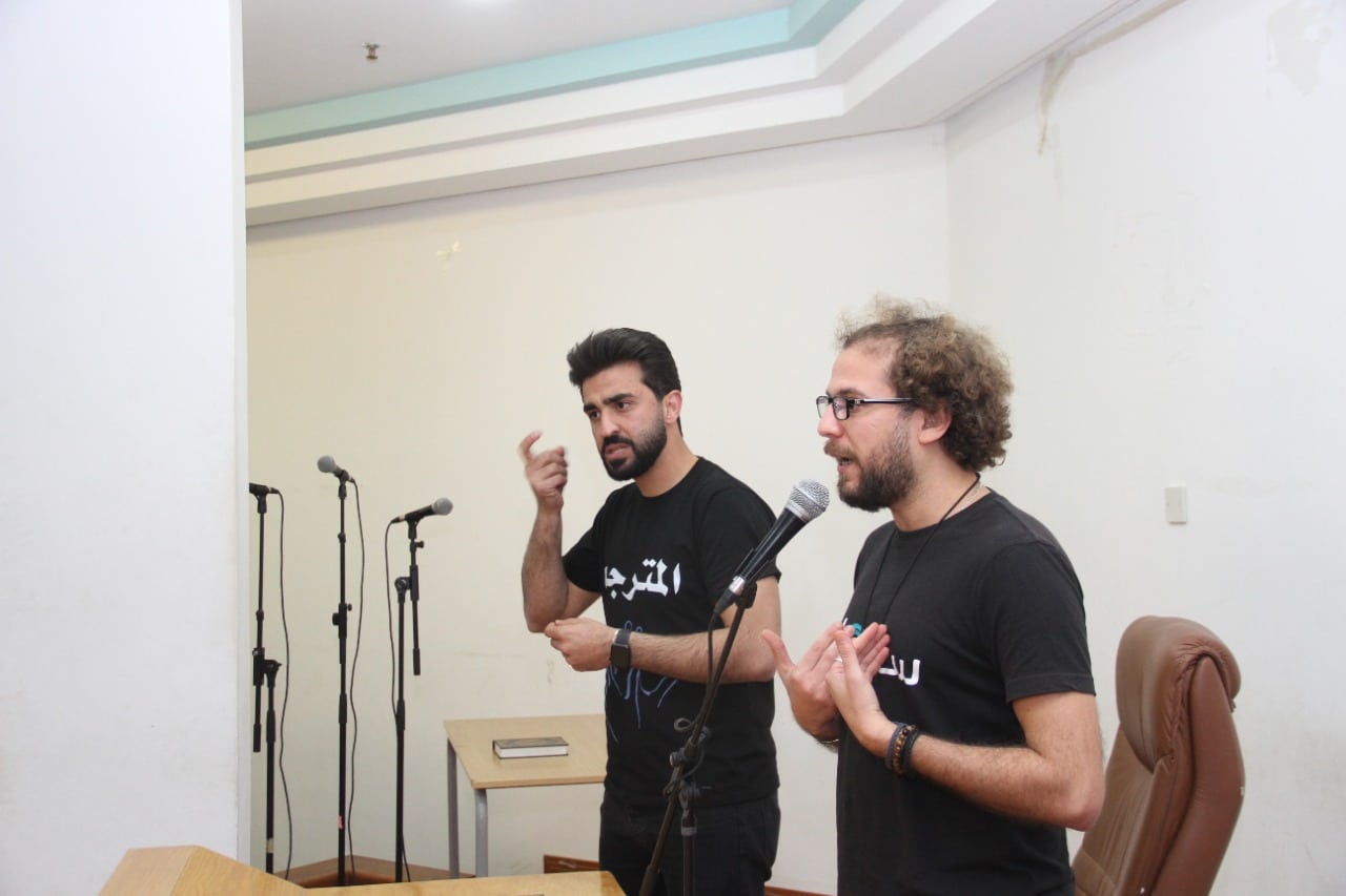 وتحدث في المحاضرة السيد هاشم قلعجي مؤسس منظمة سامعك يرافقه الطالب محمود هديب ترجمة للغة الاشارة عن نشأة منظمة سامعك ومساهمتها في متابعة شؤون أفراد المجتمع من ذوي الاحتياجات الخاصة وعن تجربته الشخصية في موضوع الصم والبكم على وجه التحديد.