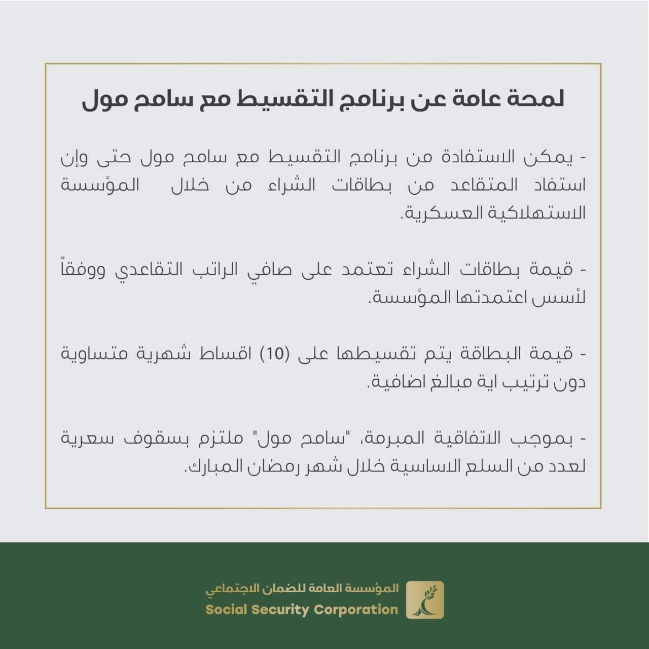 وأوضحت المؤسسة بأنه بأمكان المتقاعدين الجمع بين بطاقات الشراء من مختلف الجهات المشاركة في برنامج تقسيط، فيصبح بإمكان من حصل على بطاقات الشراء من المؤسسة الاستهلاكية العسكرية الحصول ايضاً على بطاقات الشراء من سامح مول وايضاً أي جهة تنضم لاحقاً الى البرنامج، وبينت المؤسسة إلى أن سقف الاستفادة من جميع الجهات المشاركة في البرنامج يعادل صافي الراتب التقاعدي للمتقاعد.