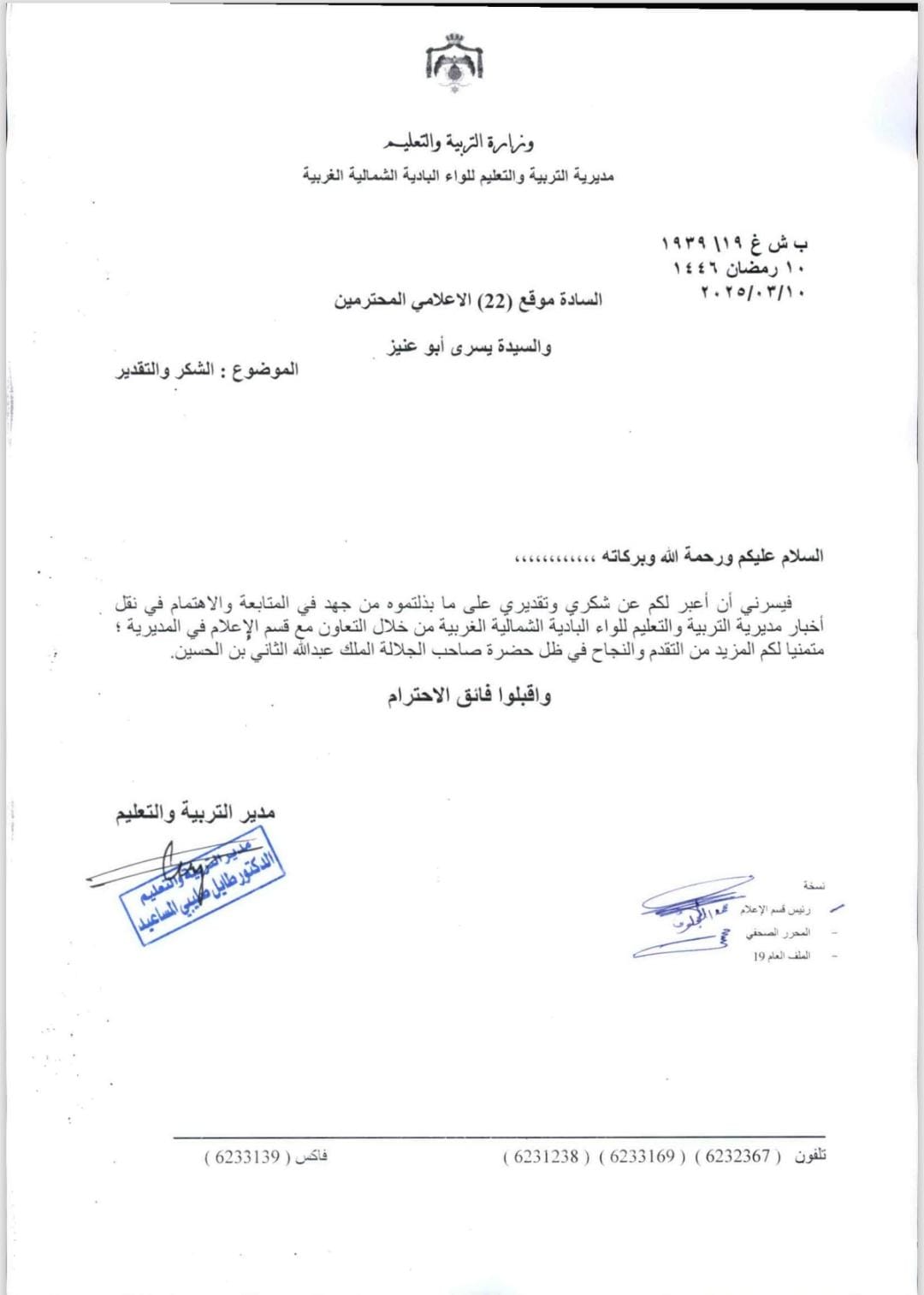 22 الاعلامي - تلقى موقع 22 الاعلامي كتاب شكر من مدير التربية والتعليم للواء البادية الشمالية الغربية على الجهود التي يبذلها كادر الموقع في نشر اخبار ونشاطات المديرية.