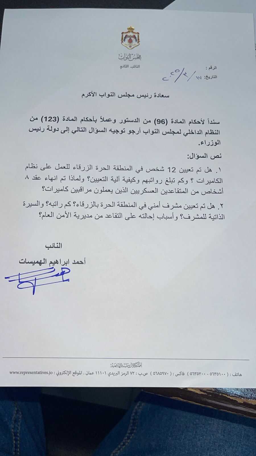 22 الاعلامي - وجه النائب الثاني لرئيس مجلس النواب احمد الهميسات سؤالين نيابين لدولة رئيس الوزراء جعفر حسان، واستناداً لأحكام المادة (96) من الدستور وعملا بأحكام المادة (123) من النظام الداخلي لمجلس النواب.